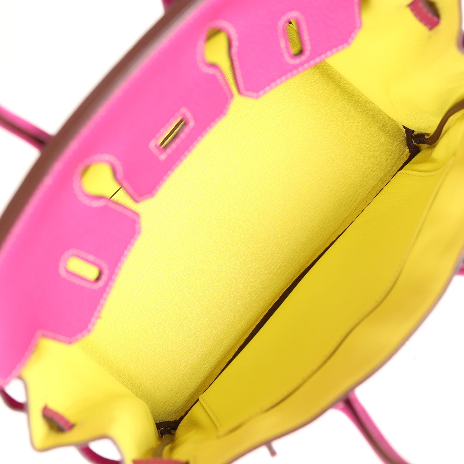 The interior is lined with Lime chevre and has one zip pocket with an Hermes engraved zipper pull and an open pocket on the opposite side.