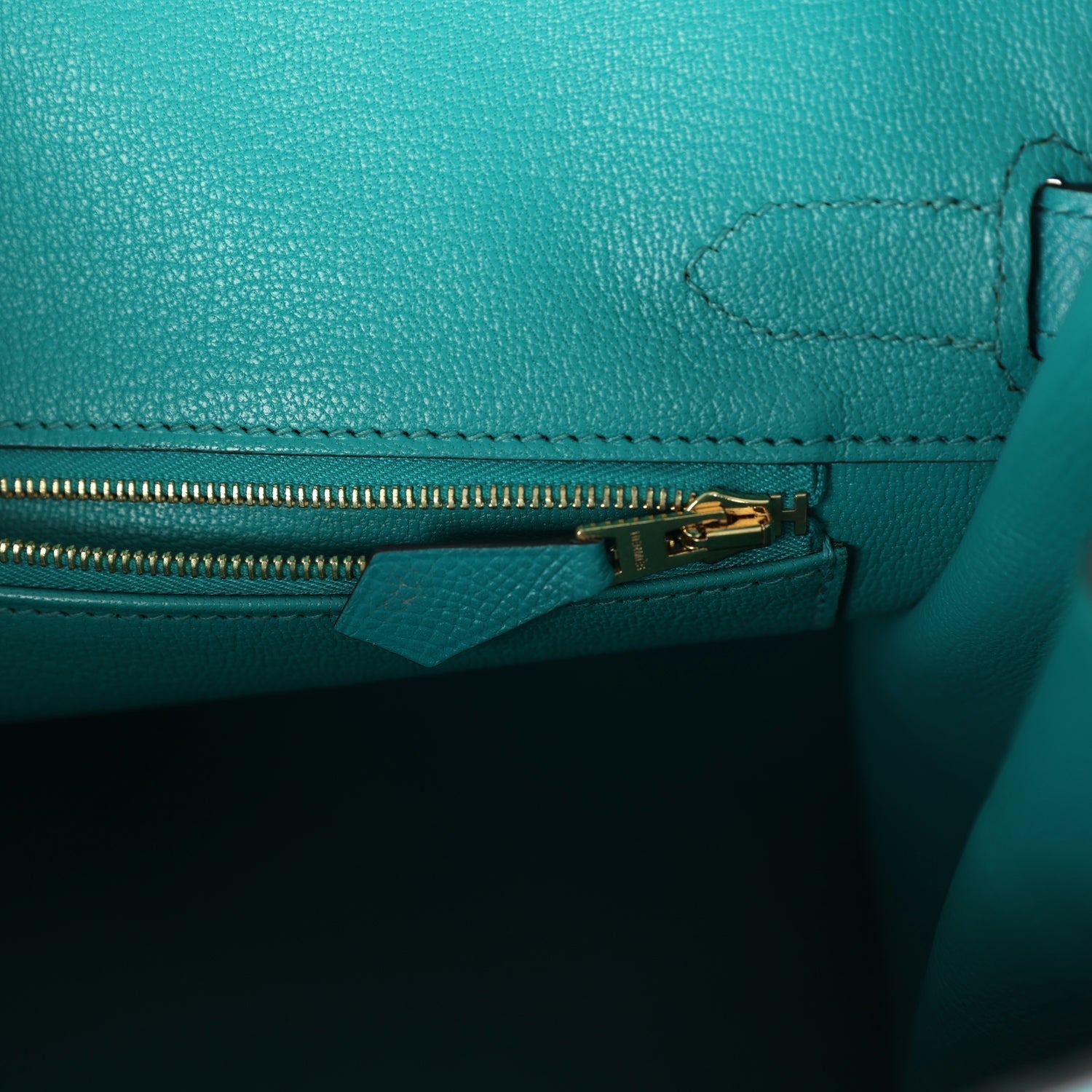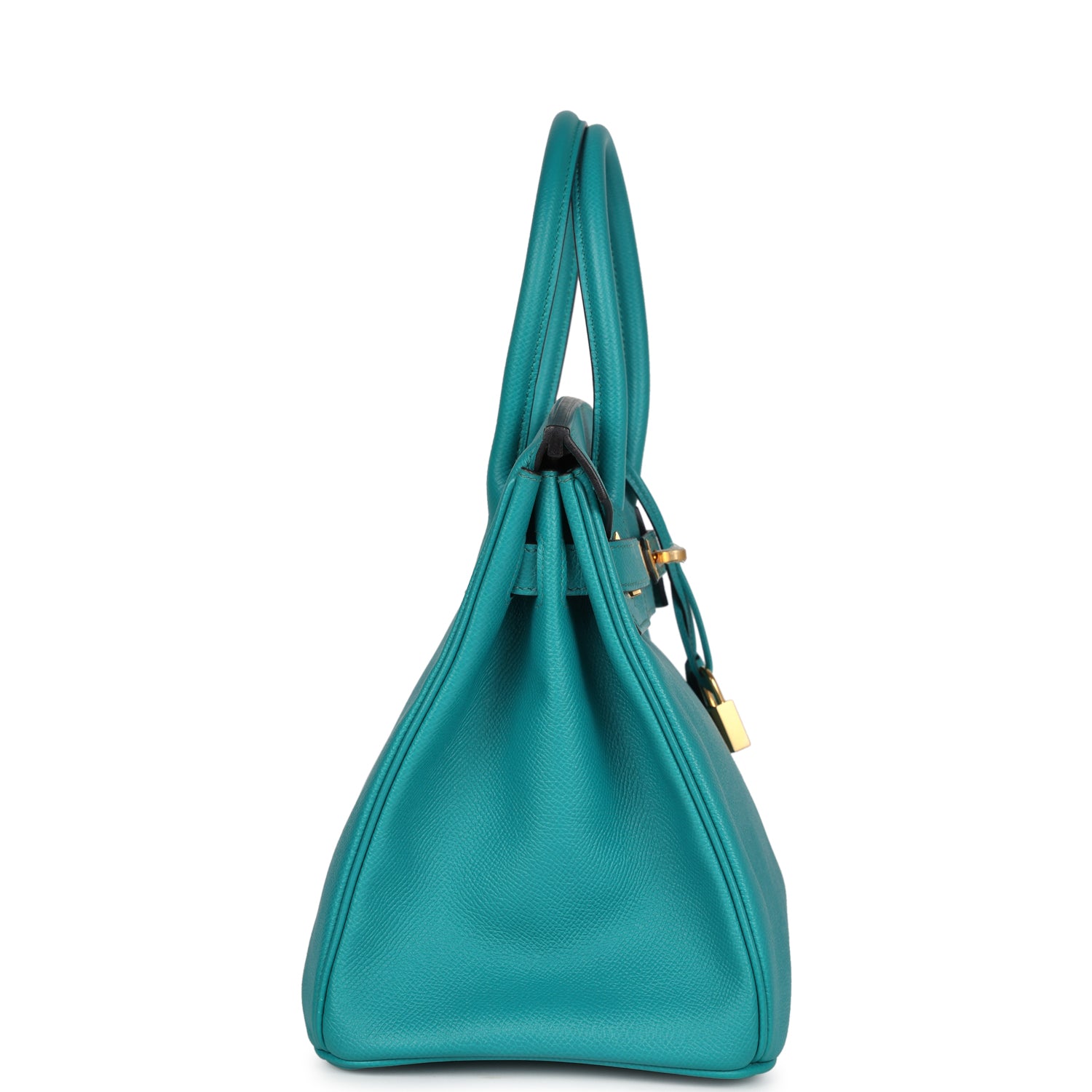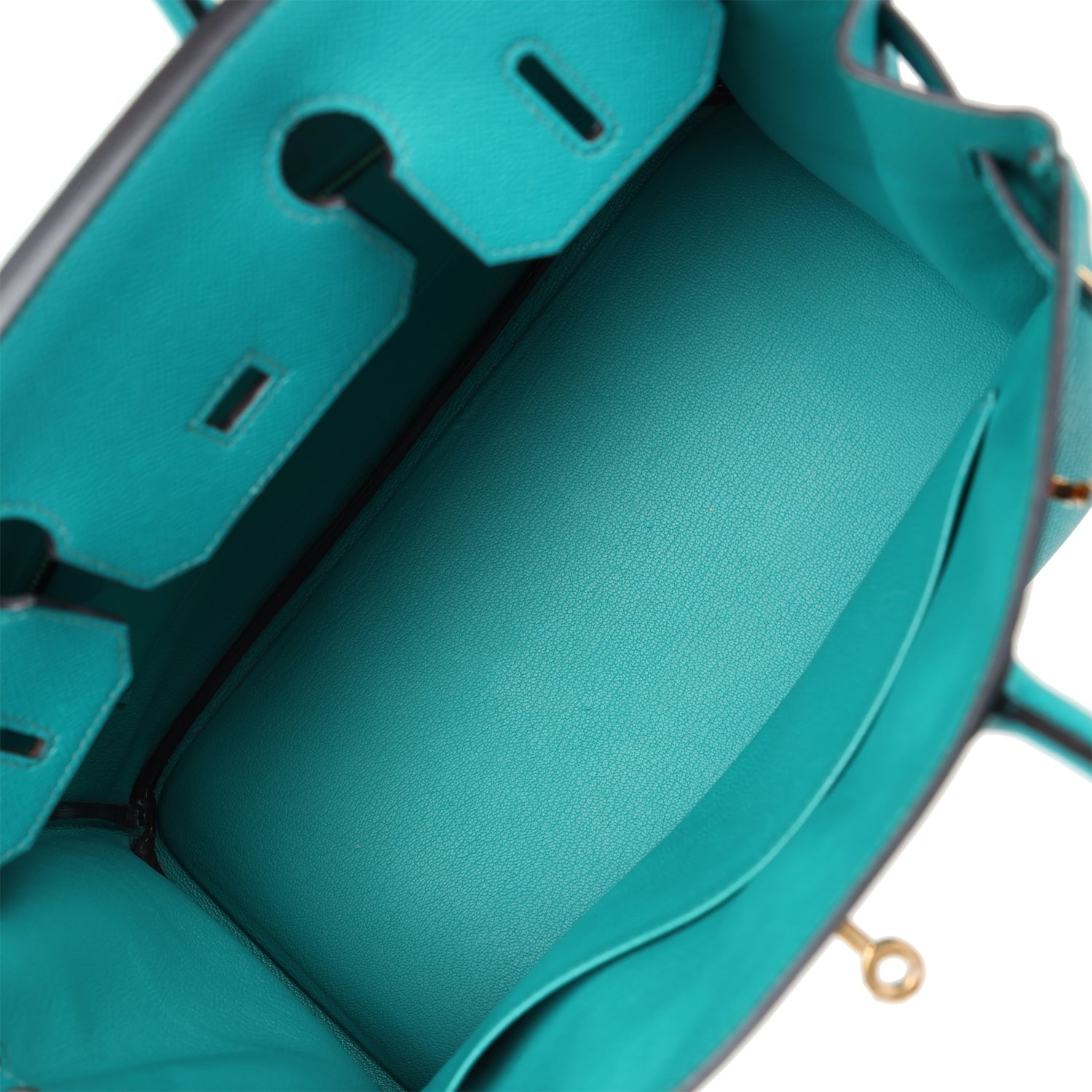 Special Order Birkin is in Bleu Paon epsom leather with gold hardware and has tonal stitching, front flap, two straps with center toggle closure, clochette with lock and two keys, and double rolled handles.