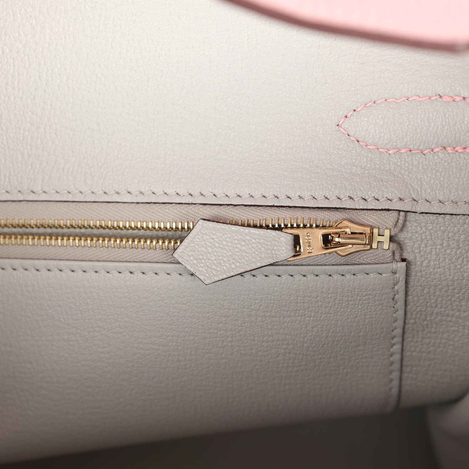 The interior is lined in Bleu Pale chevre leather and has one zip pocket with Hermes engraved pull; pocket on opposite side.