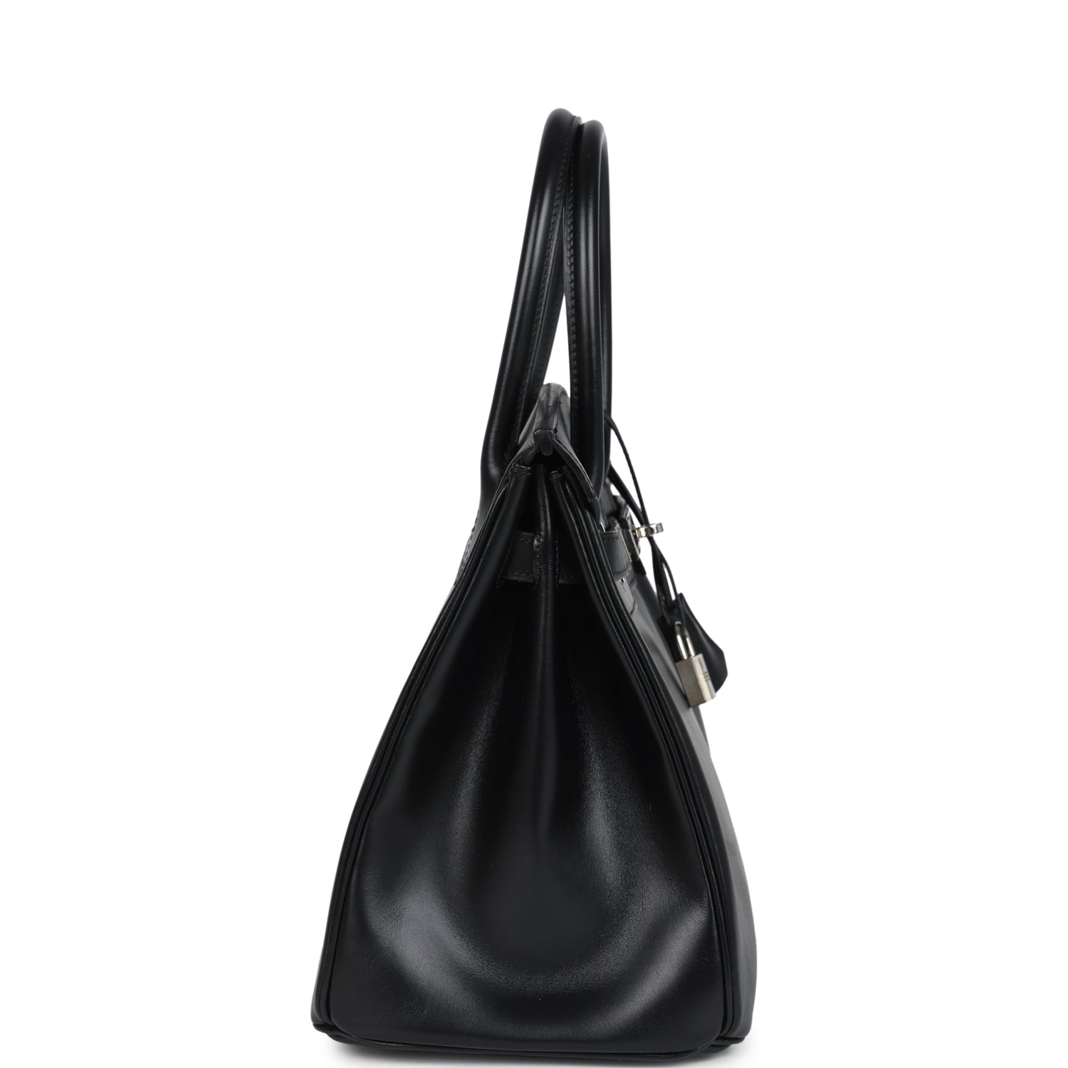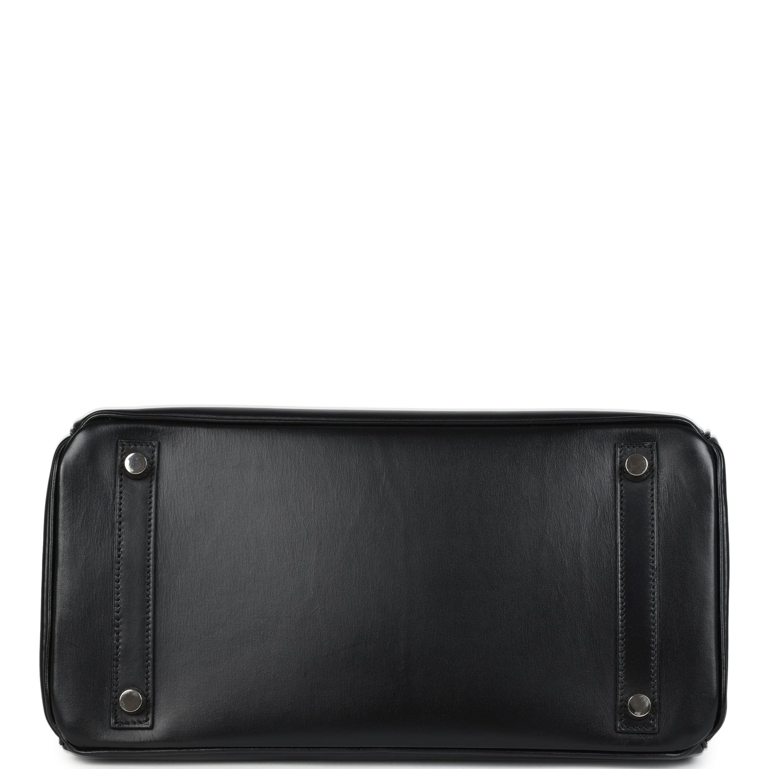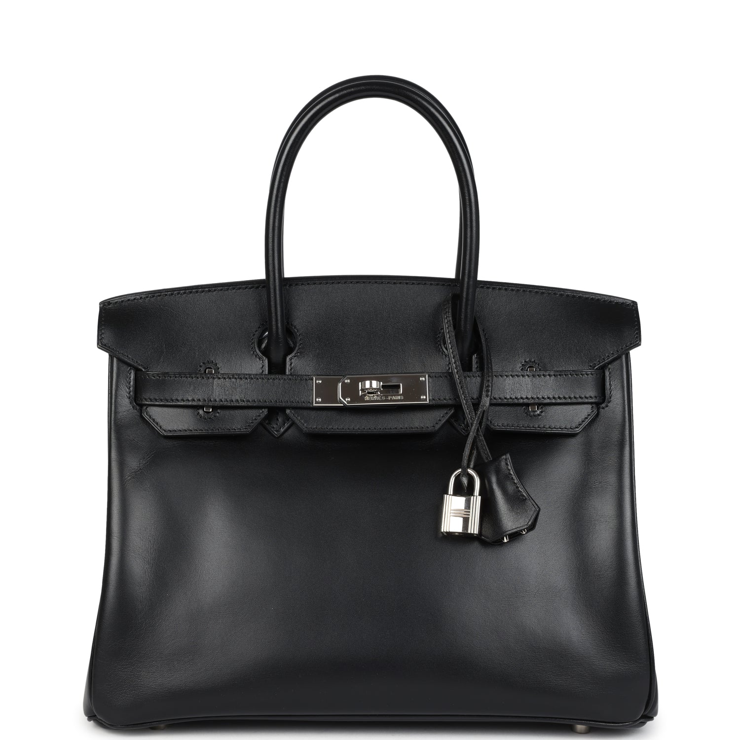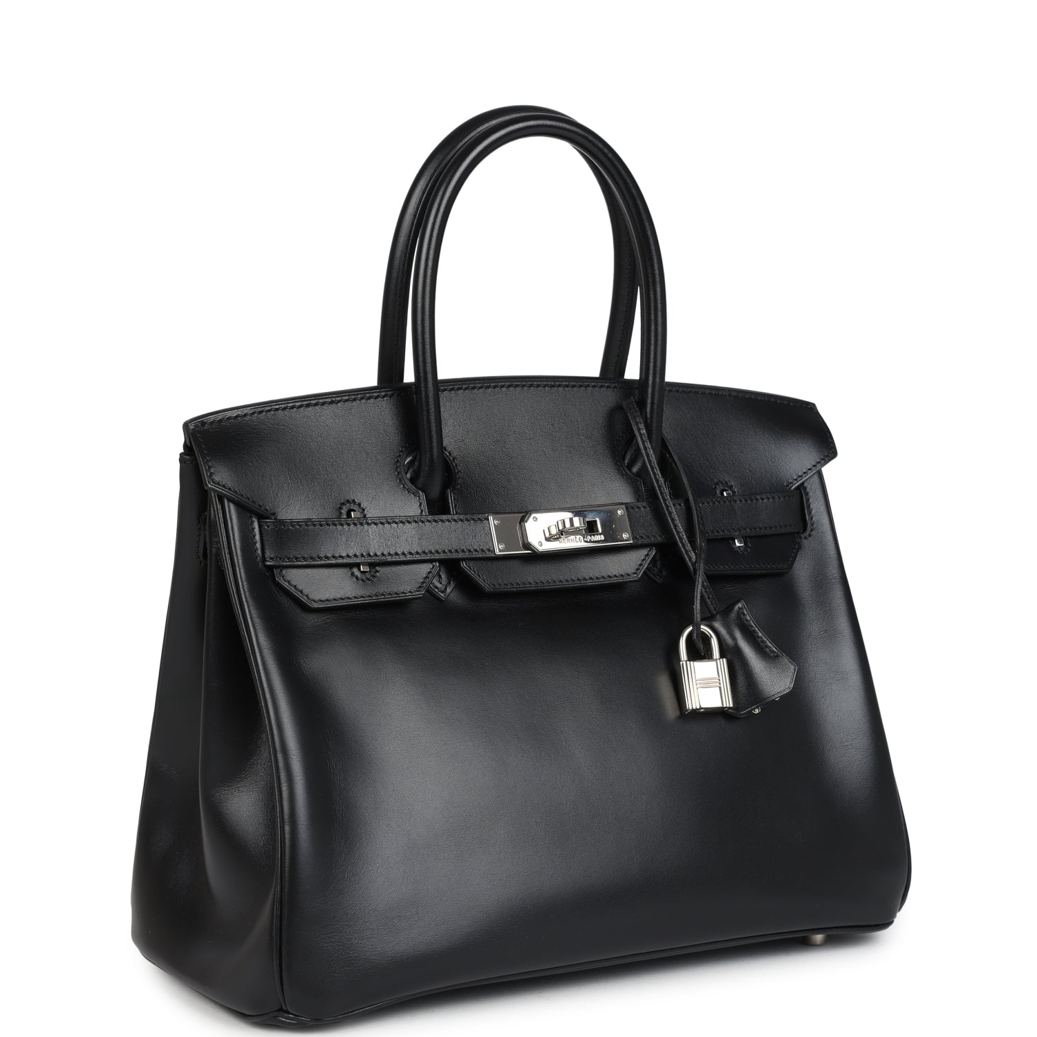 New Birkin is in Black box calfskin leather with palladium hardware and has tonal stitching, front flap, two straps with center toggle closure, clochette with lock and two keys, and double rolled handles.