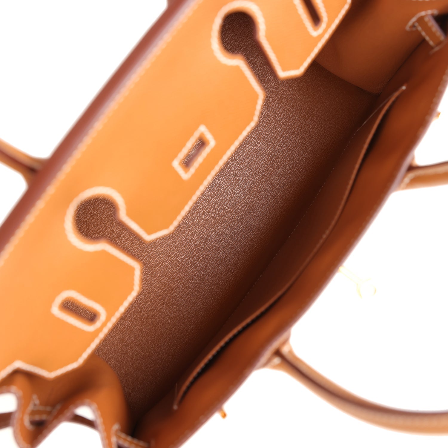 The interior is lined with Gold chevre and has one zip pocket with an Hermes engraved zipper pull and an open pocket on the opposite side.