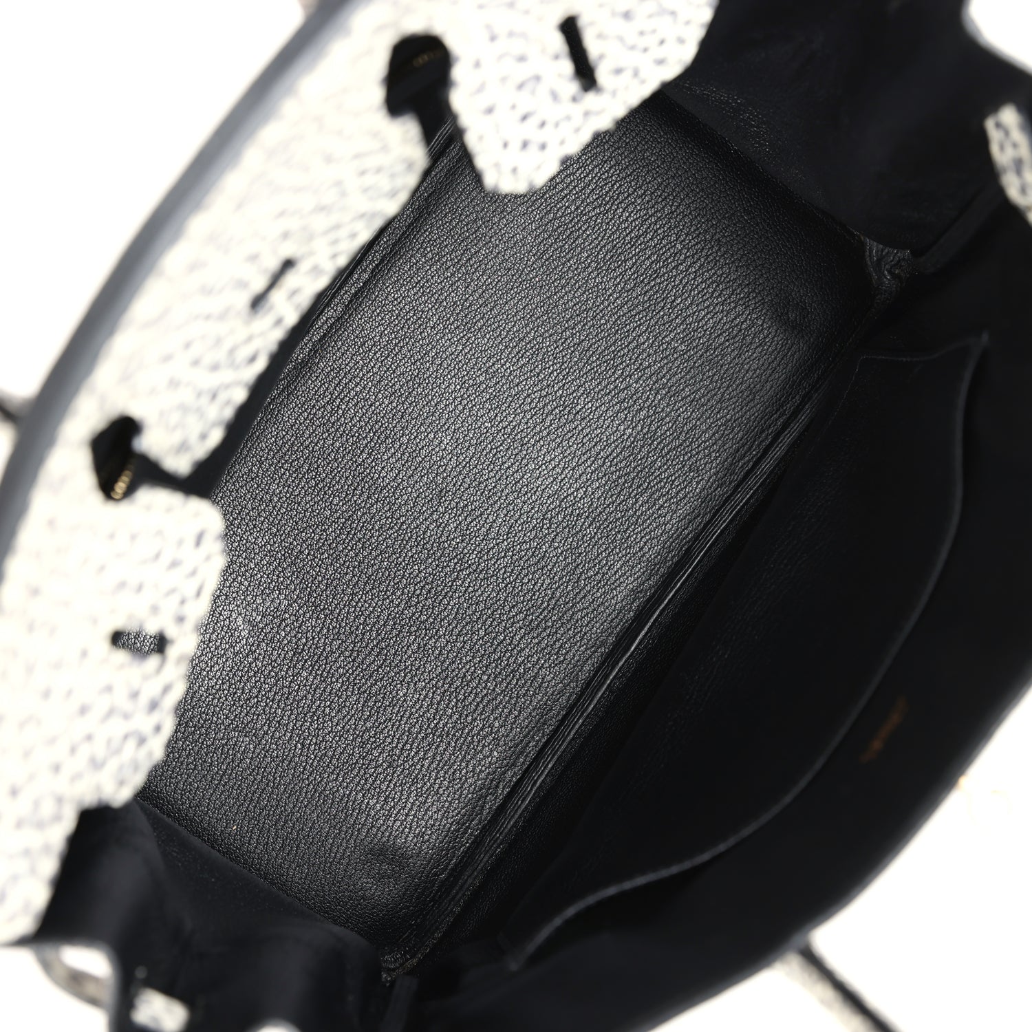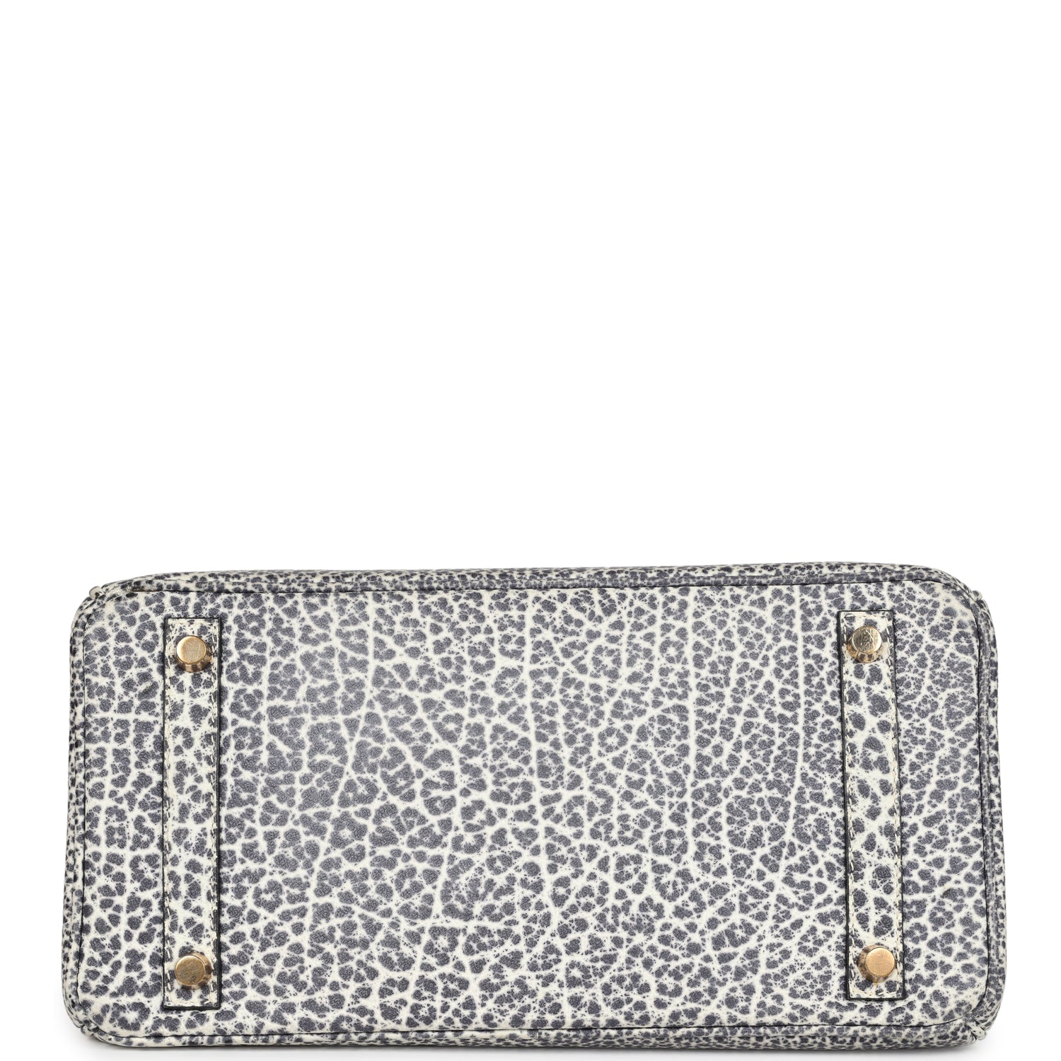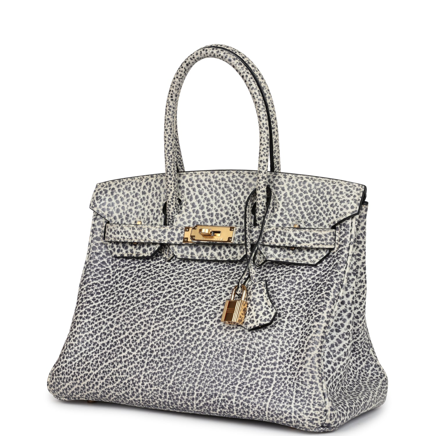 rare New Birkin is in White dalmatian buffalo leather with gold hardware and has tonal stitching, a front toggle closure, a clochette with lock and two keys, and double rolled handles.