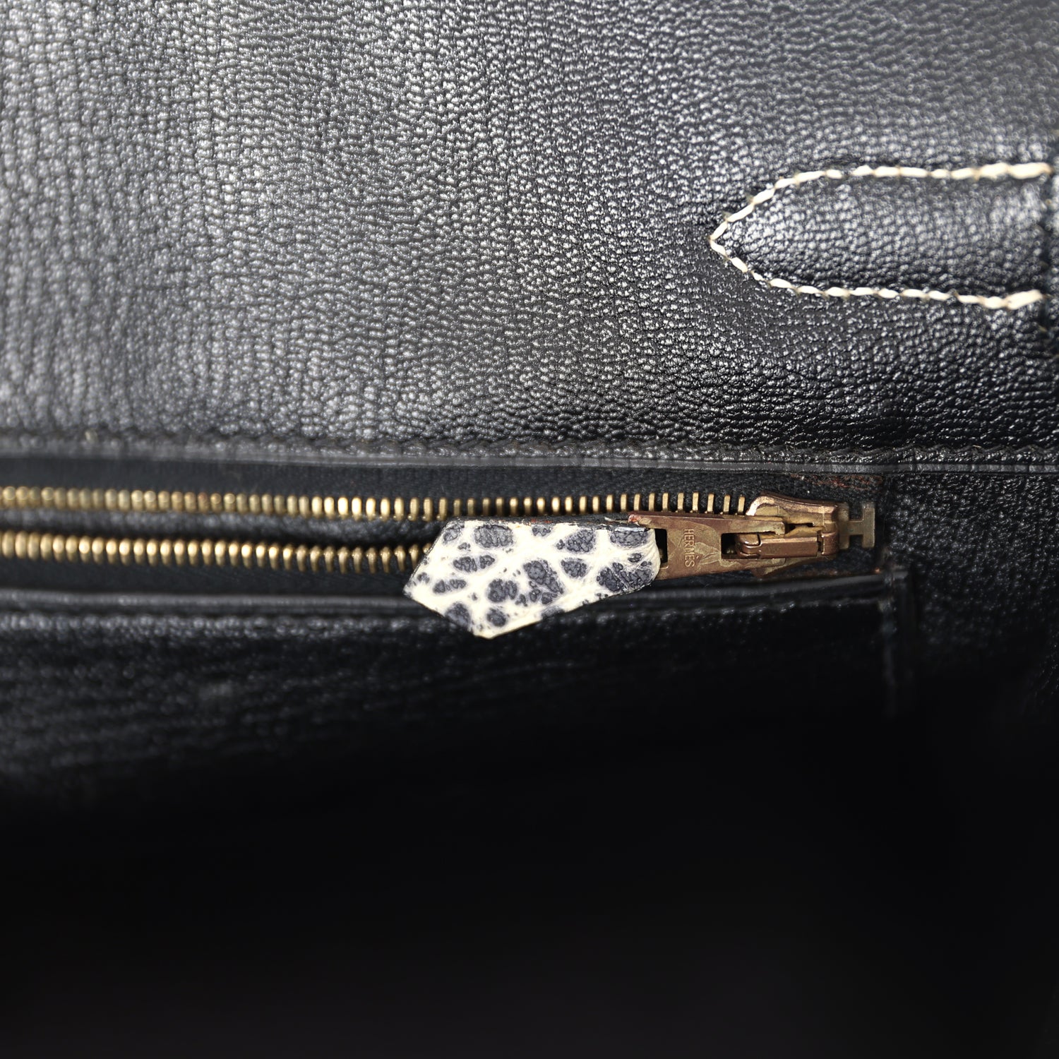 The interior is lined with black leather and has one zip pocket with an Hermes engraved zipper pull and an open pocket on the opposite side.
