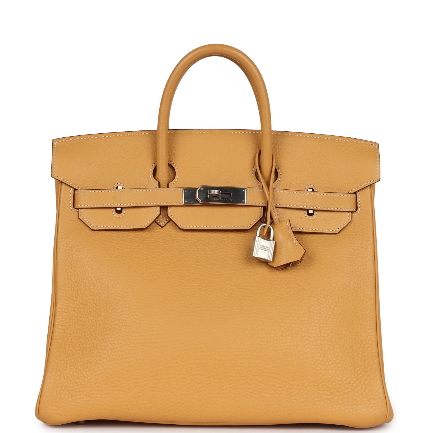 New Birkin 32 is in Natural Sable Fjord leather with brushed palladium hardware and has contrast stitching, two straps with front toggle closure, clochette with lock and two keys and double rolled handles.