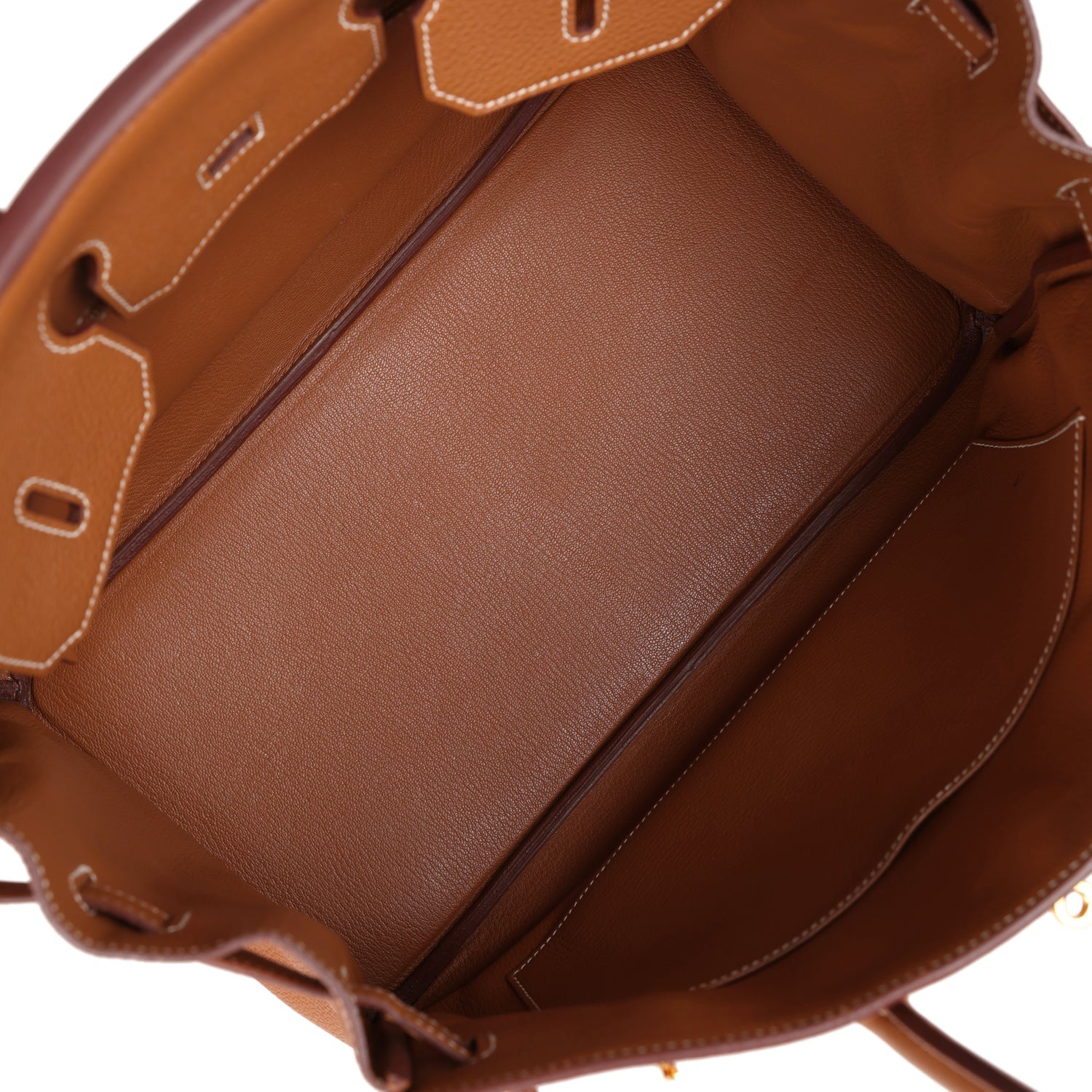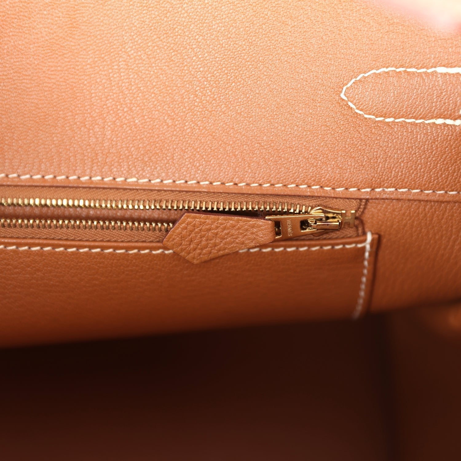 The interior is lined with Gold chevre and has one zip pocket with an Hermes engraved zipper pull and an open pocket on the opposite side.