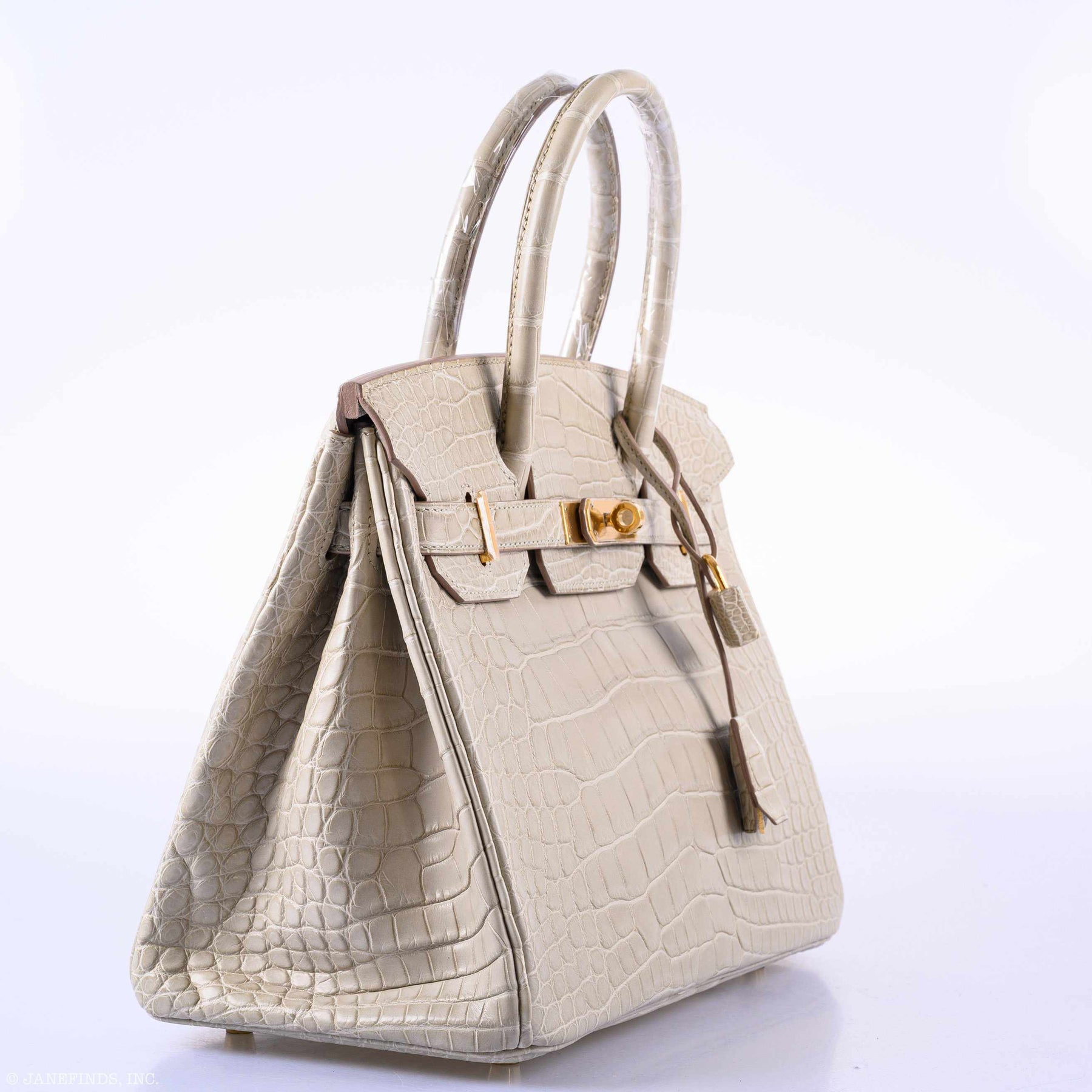 This store-fresh example is exceptional, featuring gold hardware crafted from matte Beton Alligator, a highly sought after shade that is limited by its difficulty of production. To create light tones, first the natural pigments must be stripped, a process which can easily damage lower-quality skins. One of Hermès’ highest prized exotic shades is Beton.
