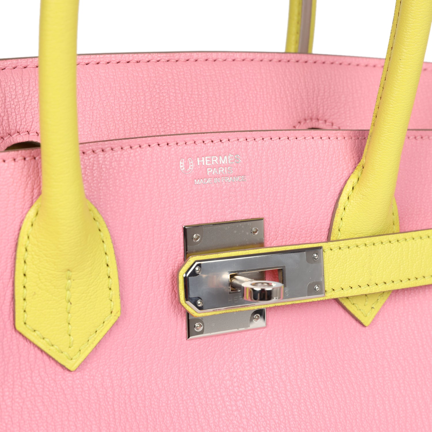 Special Order Birkin is in Rose Confetti and Lime chevre mysore leather with palladium hardware and has tonal stitching, front flap, two straps with center toggle closure, clochette with lock and two keys, and double rolled handles.