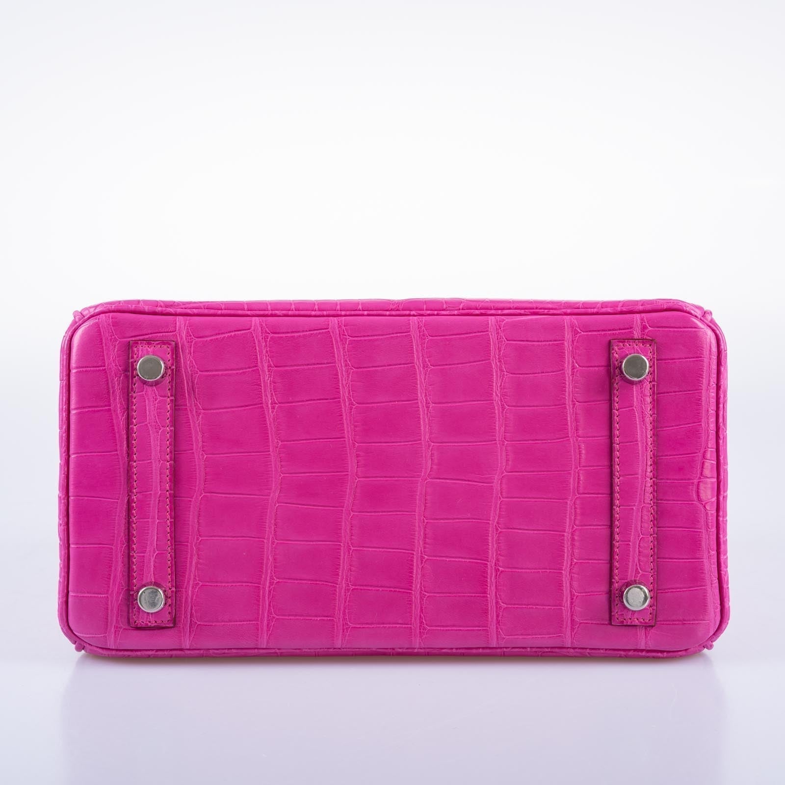 The rarity of this color enhances the uniqueness of the bag it adorns - an exquisitely crafted 25cm Birkin, which is rendered in the most luxurious matte Alligator leather and furnished with sleek Palladium hardware. This shade of Rose Shocking, though undeniably captivating, is exceptionally challenging to procure, further elevating the exclusivity of this remarkable bag.