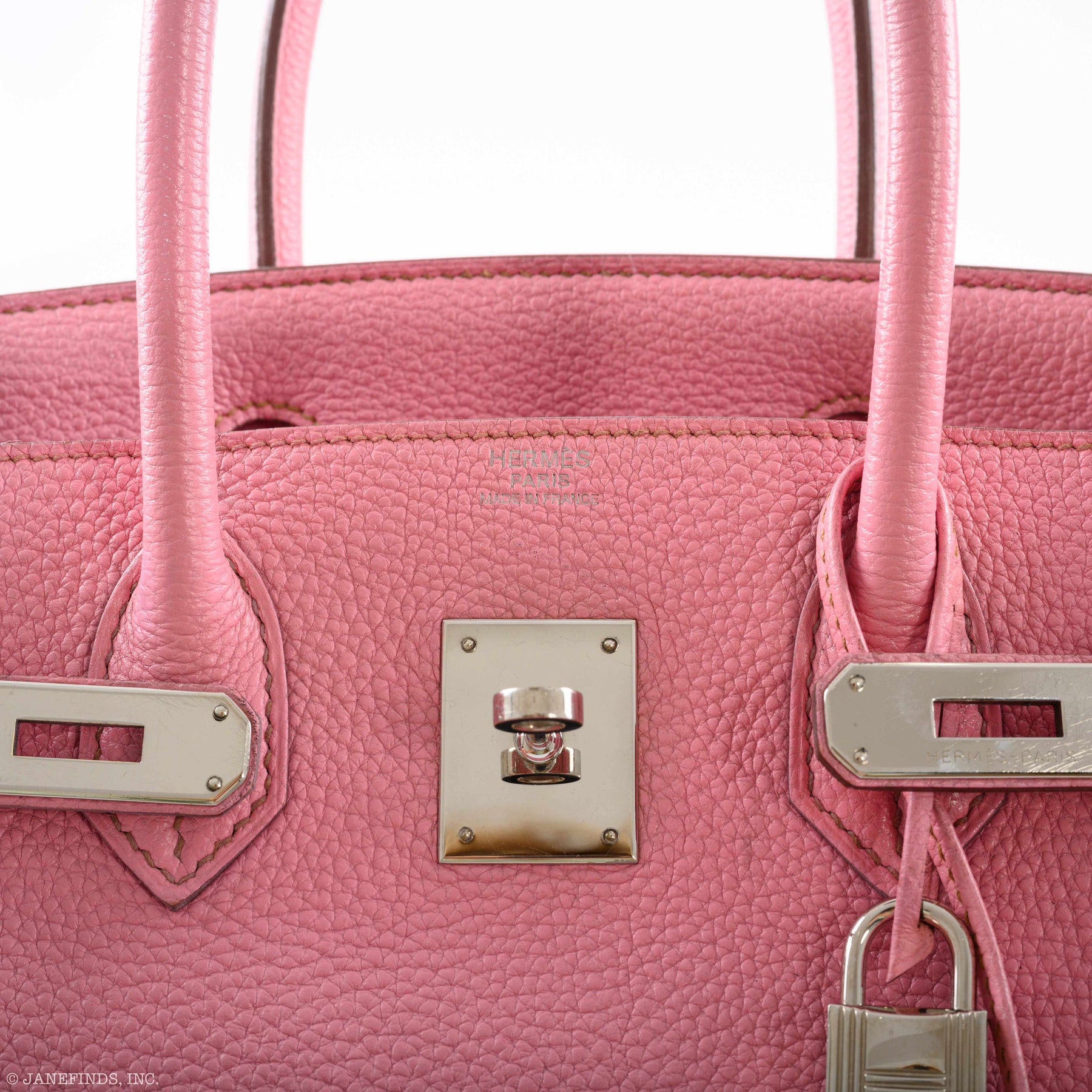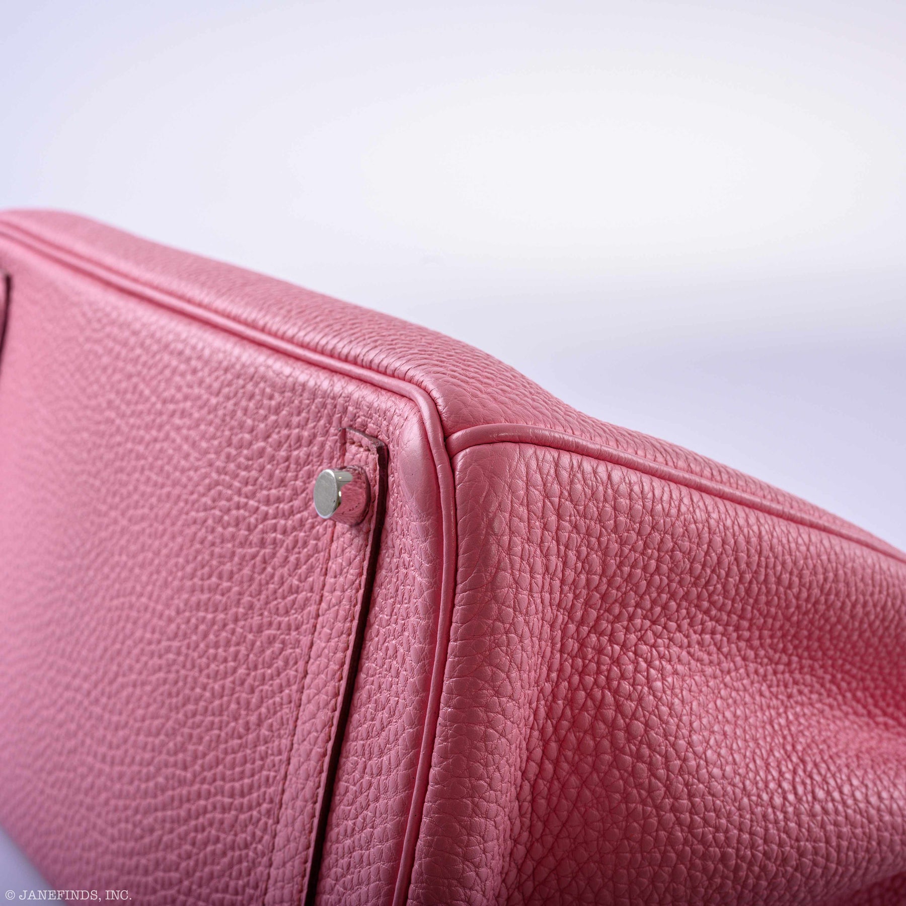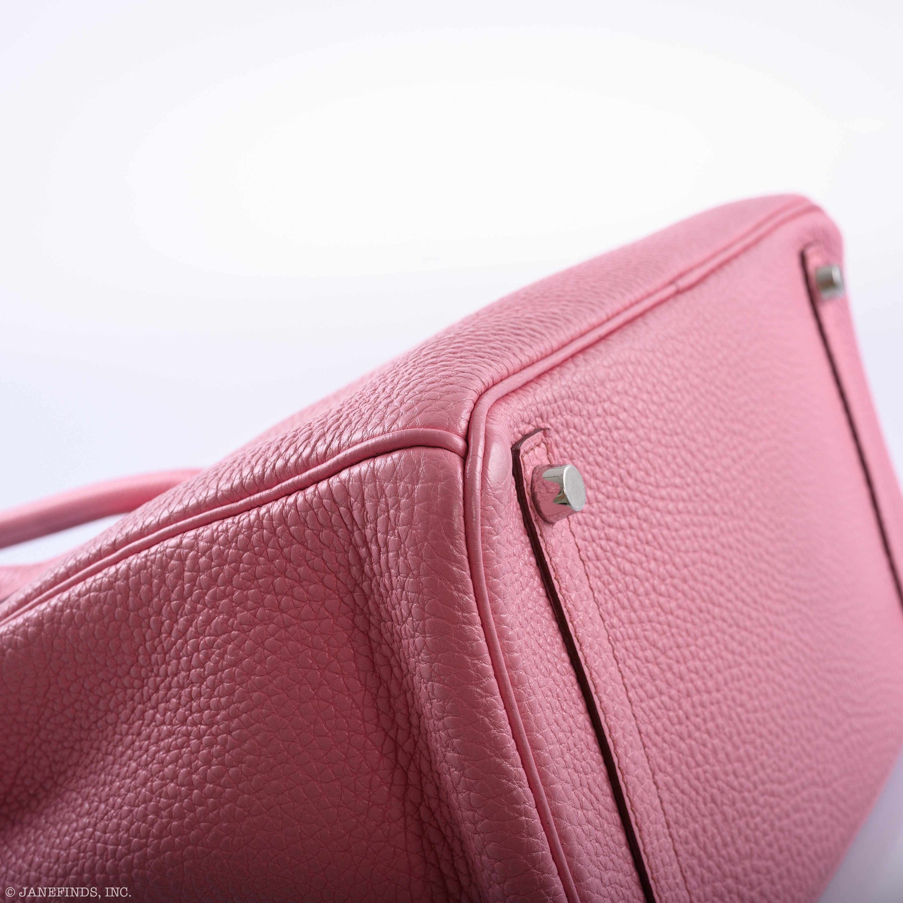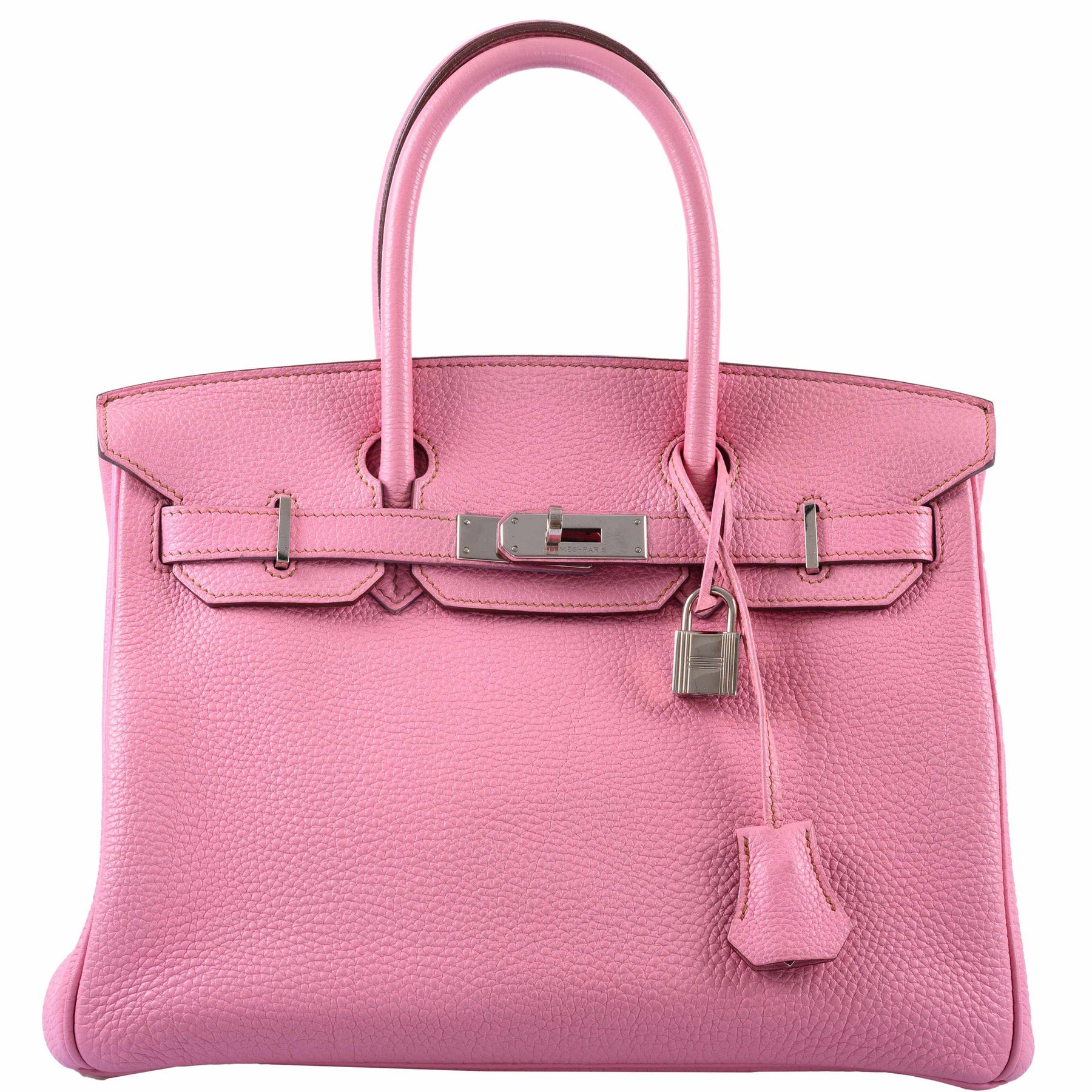 Very rare and coveted among collectors... Pink 5P no longer available Birkin 30cm in Togo leather with Palladium hardware. This Birkin is an incredible shade of pink with mauve contrast stitching. The interior is lined in pink Chèvre with one zip pocket with an Hermès engraved zipper pull and an open pocket on the opposite side. This color is universal will go with everything all season. A staple bag.