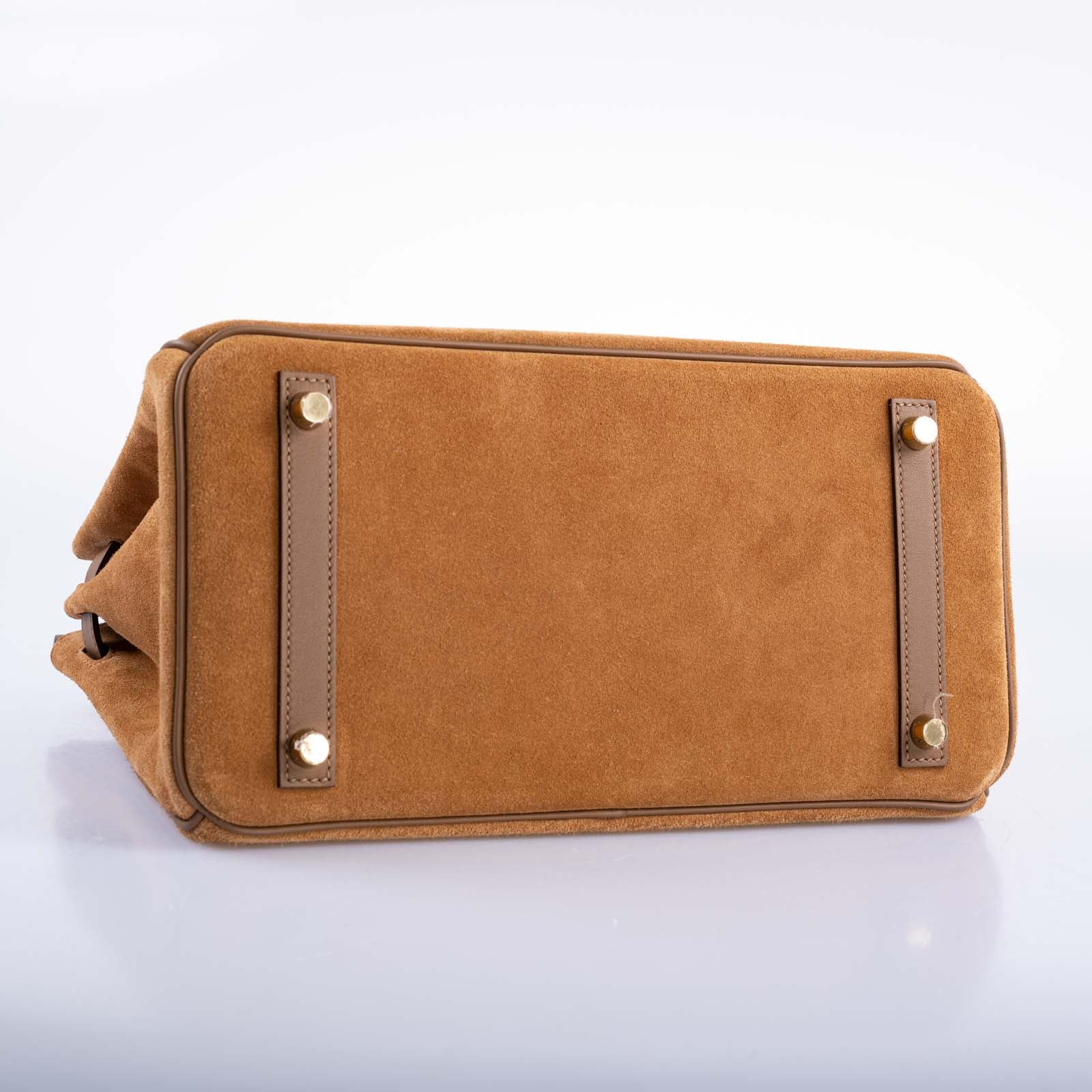 The Grizzly Birkin is a limited edition bag named after its showcase material, the Veau Doblis - doblis French for suede. Its soft and supple body features ghillies-esque Argile Swift styling and is lined with toile herringbone canvas and leather slip pockets. The suede material of this bag develops unique patinas and marks over time, enhancing its visual appeal. The Alezan and Chamois colorway makes this bag an exceptional addition to any collection. Although Hermès is renowned for its exquisite leather craftsmanship, suede is a seldom-Newmaterial in their bags. This fuzzy material is derived from the underside of the skin, making it softer and more flexible than the outer layer.