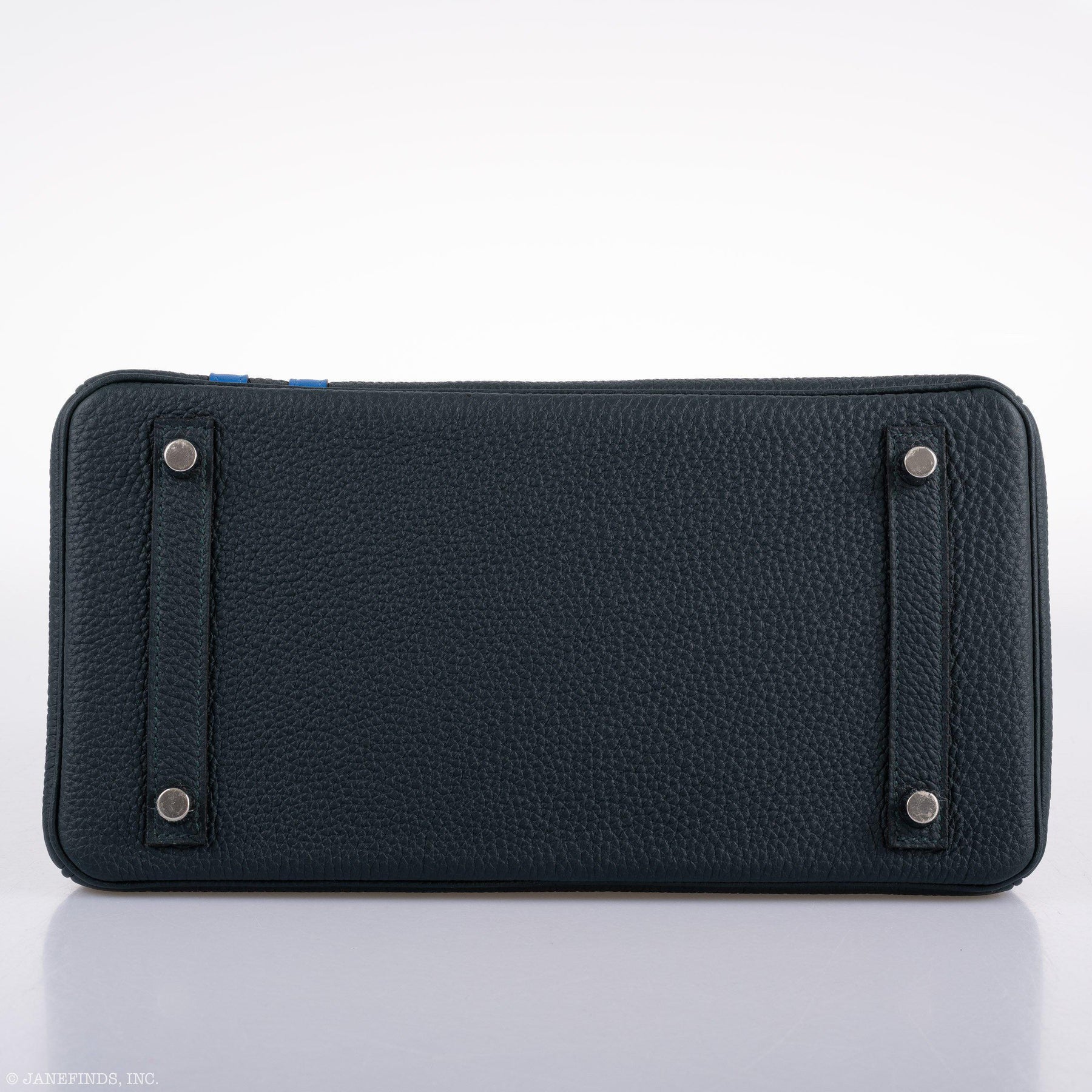 Hermès Birkins are famously hard to get, only offered to loyal customers of the brand, but even rarer is the opportunity to special order a custom Birkin. Shown here is a very limited edition, the Officier Birkin done in Vert Cyprès Togo and Bleu Zellige officer stripes and interior lining. The Officier Birkin - Military aesthetics have always been a draw of inspiration for fashion, from camouflage prints, to padded shoulders, and to severe structured silhouettes. Hermès turned their attention to this trend in a subtle way with the Officier Birkin in 2018. Incorporating two Swift leather stripes down the left side of the front, the Officier Birkin evokes the decorated shoulder sleeve insignia of uniformed officers, hence the name Officier Birkin.