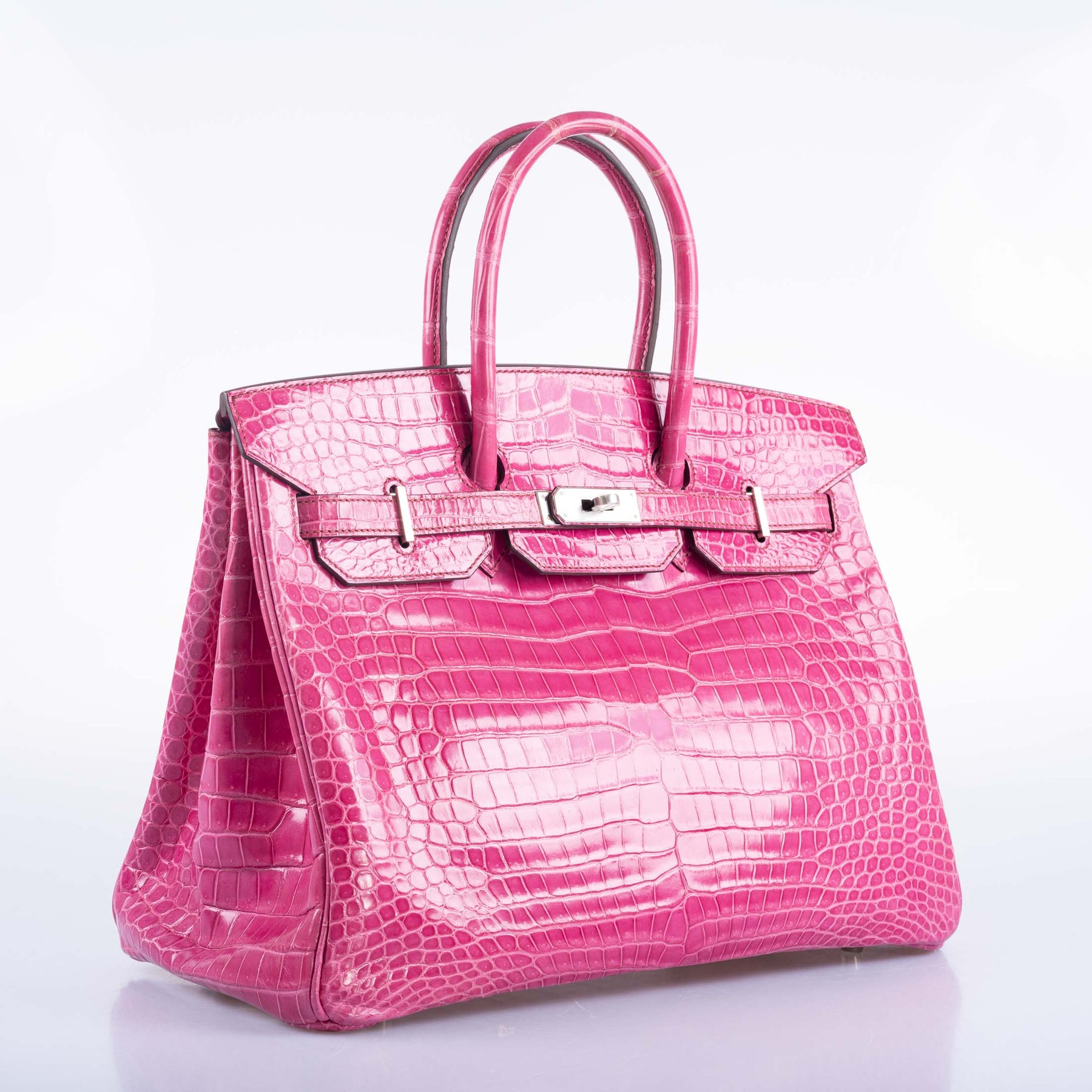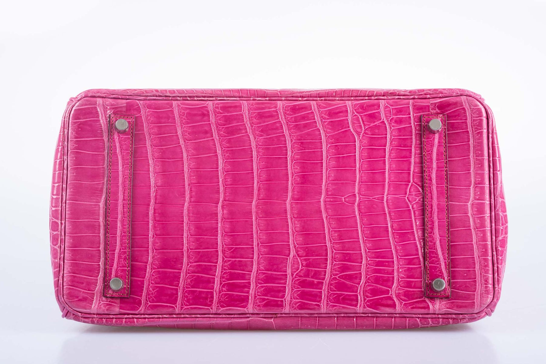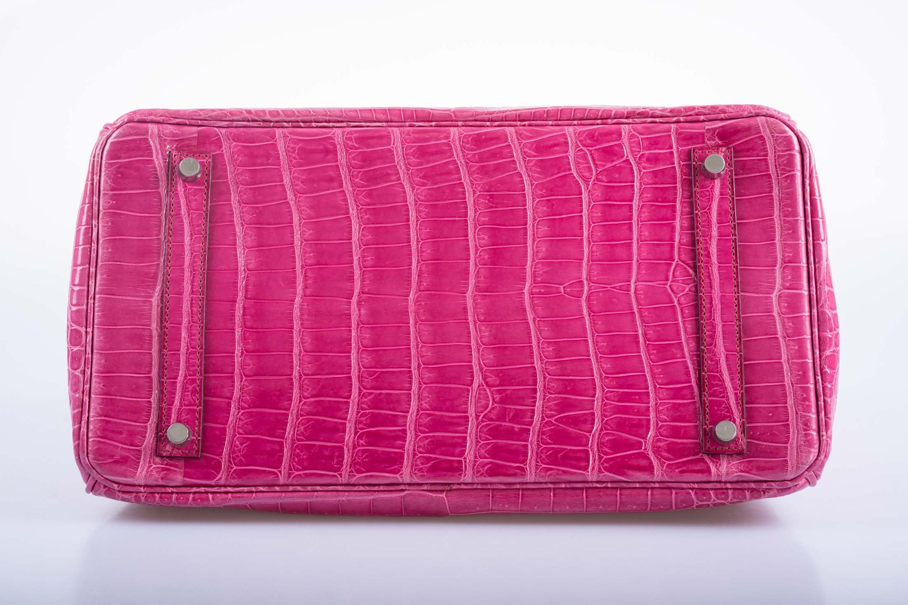 Fuschia is arguably Hermes' best pink for shiny crocodile. The pinkness of the shade is perfect, not leaning towards orange or purple. Each scale holds a slight variation on the hue, making for a multifaceted color that goes beyond ‘pink.’ This 35cm Birkin is made from shiny Fuchsia Porosus Crocodile, the finest and most expensive skin Hermes uses. Paired with Palladium hardware, this bag gives off opulence at every angle. Though missing the clochette, this Birkin has been maintained in excellent condition since its production in 2008.