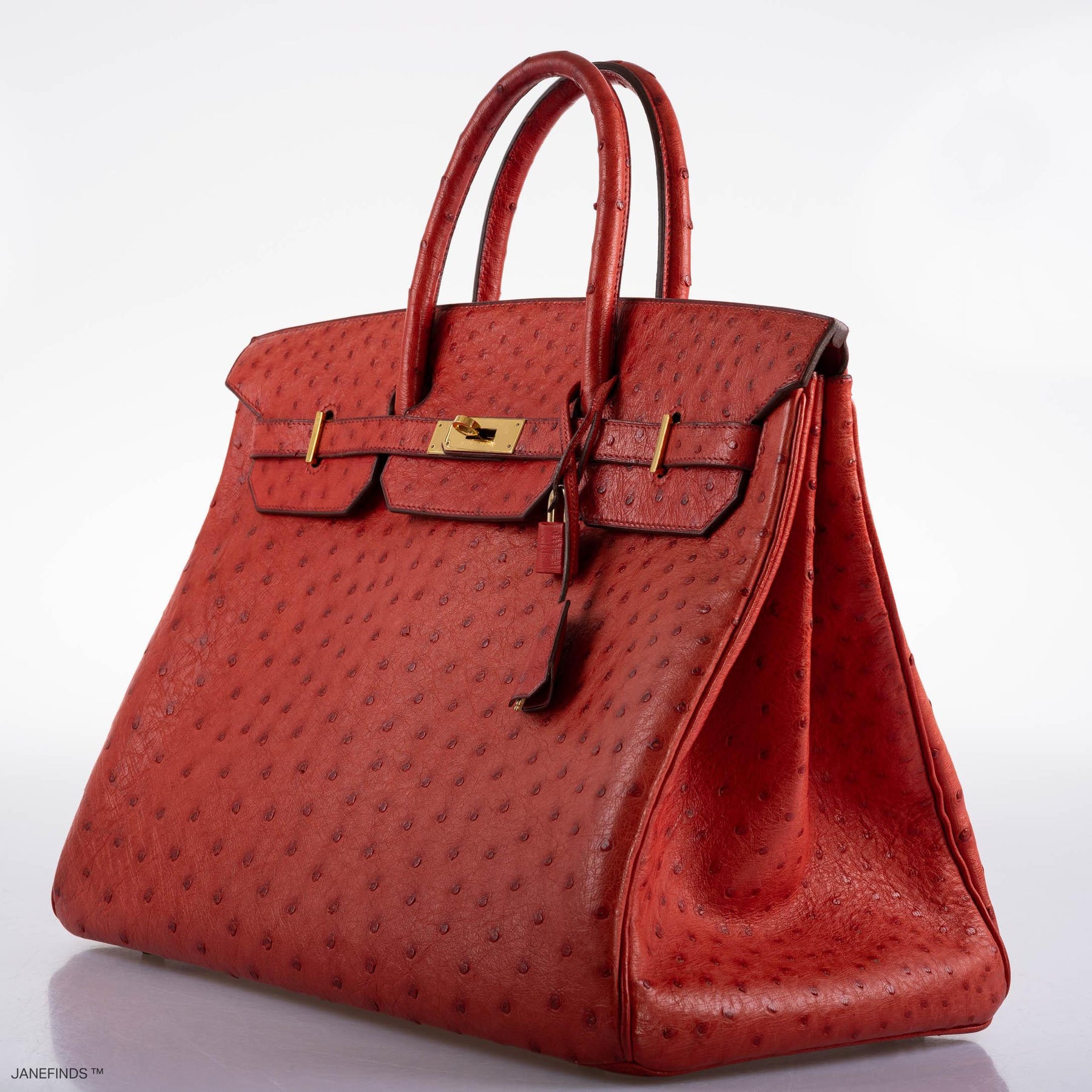 Exotic Birkins are a rarity unto themselves, but due to Hermès’ strictly high standards, in recent decades they’ve stopped using Ostrich skins larger than 30cm, as they’re no longer able to find large skins with dense and even quills. This 40cm Birkin is an exceptional example from the early 1990’s, a massive showcase of the Ostrich skin, here in bright Rouge Vif red set with warm gold hardware. Carefully kept and maintained in very good condition, this rare bag not only checks boxes as a collectible, but is also stunningly beautiful; big and bright in person, like a giant juicy strawberry!