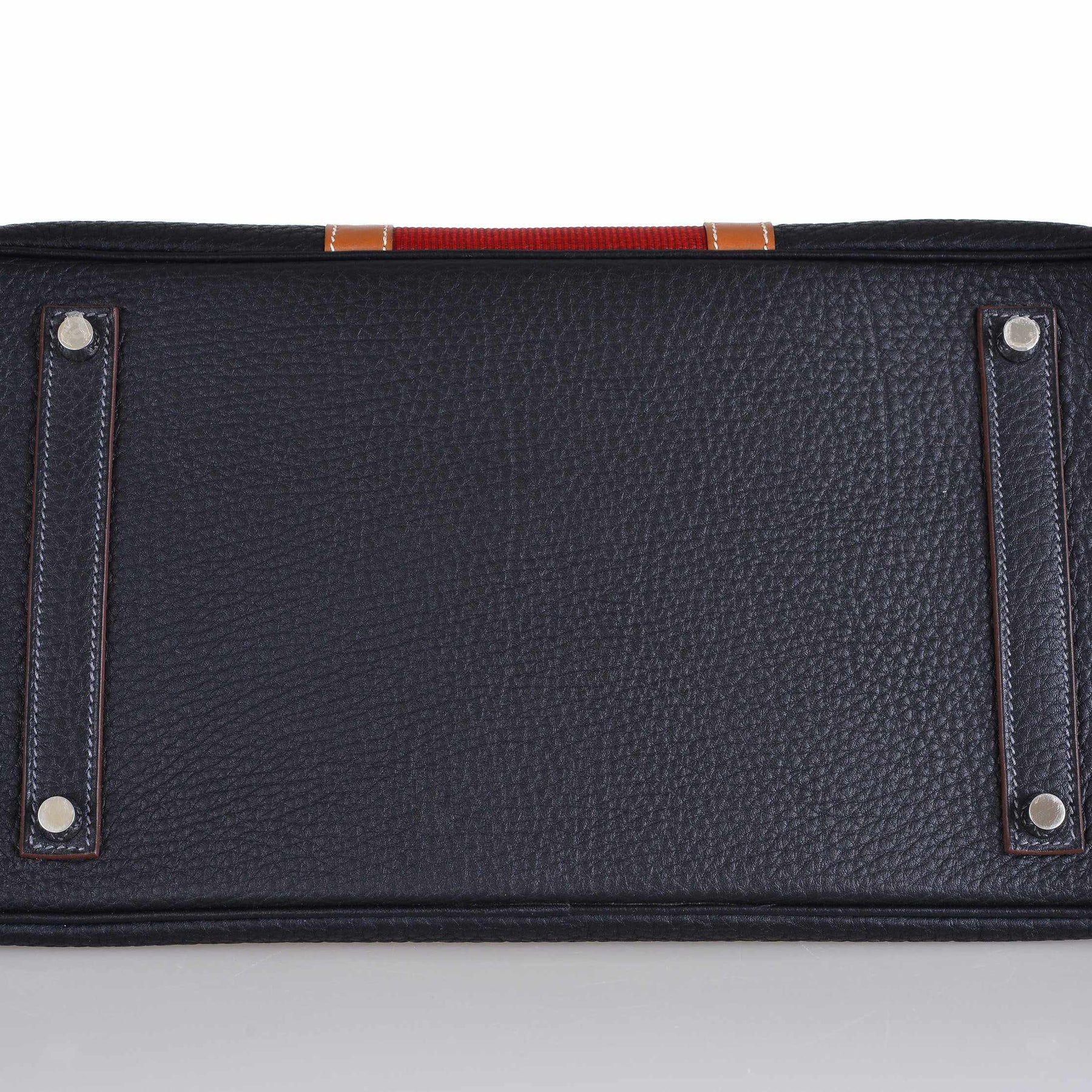 After the success of Hermès’ limited edition Candy Collection, the brand’s next seasonal alteration of the classic Birkin bag took things to the next level. Going beyond contrasting interior colors, the Club Birkins added different materials in the form of a bold stripe down the center of the bag. The most striking versions of the Club feature Crinoline made from woven horse hair in the center, framed by Barenia leather. This 35cm example is one such bag, sporting the unique strip of Barenia leather across the top, moving the Hermès brand stamp to the interior. The bright red Crinoline contrasts with the sturdy Indigo Fjord leather, all topped with Palladium hardware, and kept in exceptional condition. The combination of horse hair and Barenia aligns this bag strongly with Hermès equestrian roots.