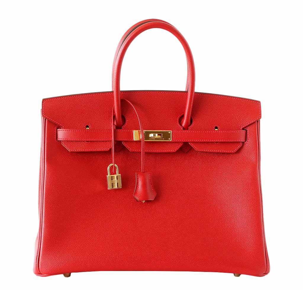 This timeless Hermès Birkin 35cm bag is made from Epsom leather, which is highly resistant to scratching and is an embossed type of leather. This bag is featured in the Rouge Casaque color, which is a red tone. This bag is accentuated by gold hardware and is in store-fresh condition, having never been carried.