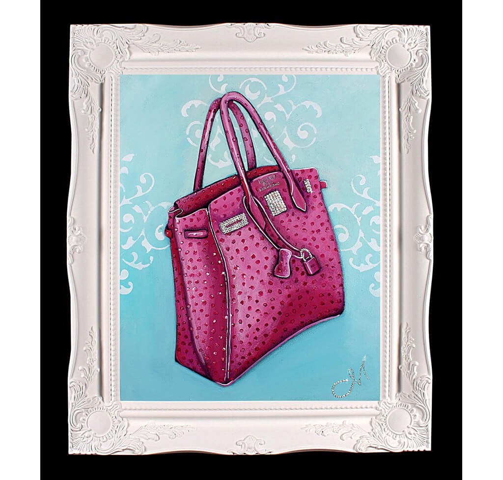 A one-off, unique work of art, this original Fuchsia Birkin painting is simply stunning. Featuring a pale blue background, this depiction of a Hermès Birkin Pink Ostrich Bag is created using golden fluid acrylic. Adding a dazzle are the Swarovski crystals AB embellishments and a finish of high gloss varnish ensures this masterpiece will be protected while hanging in any area of the home or office. The custom made frame encloses the painting and is hand finished with a Farrow and Ball, off-white shade to further enhance this beautiful piece. A certificate of authenticity signed by the artist and an embossed leather label are also included.