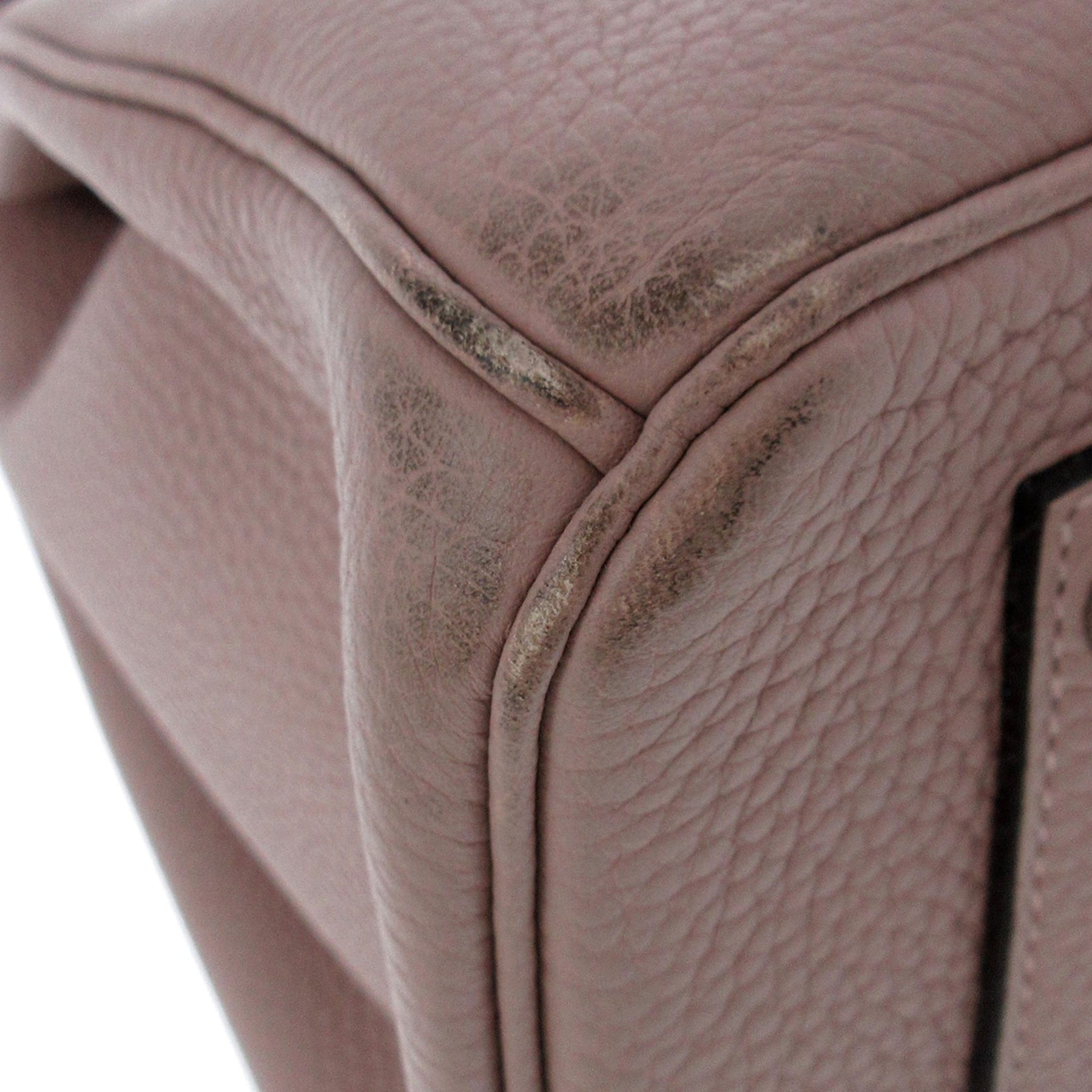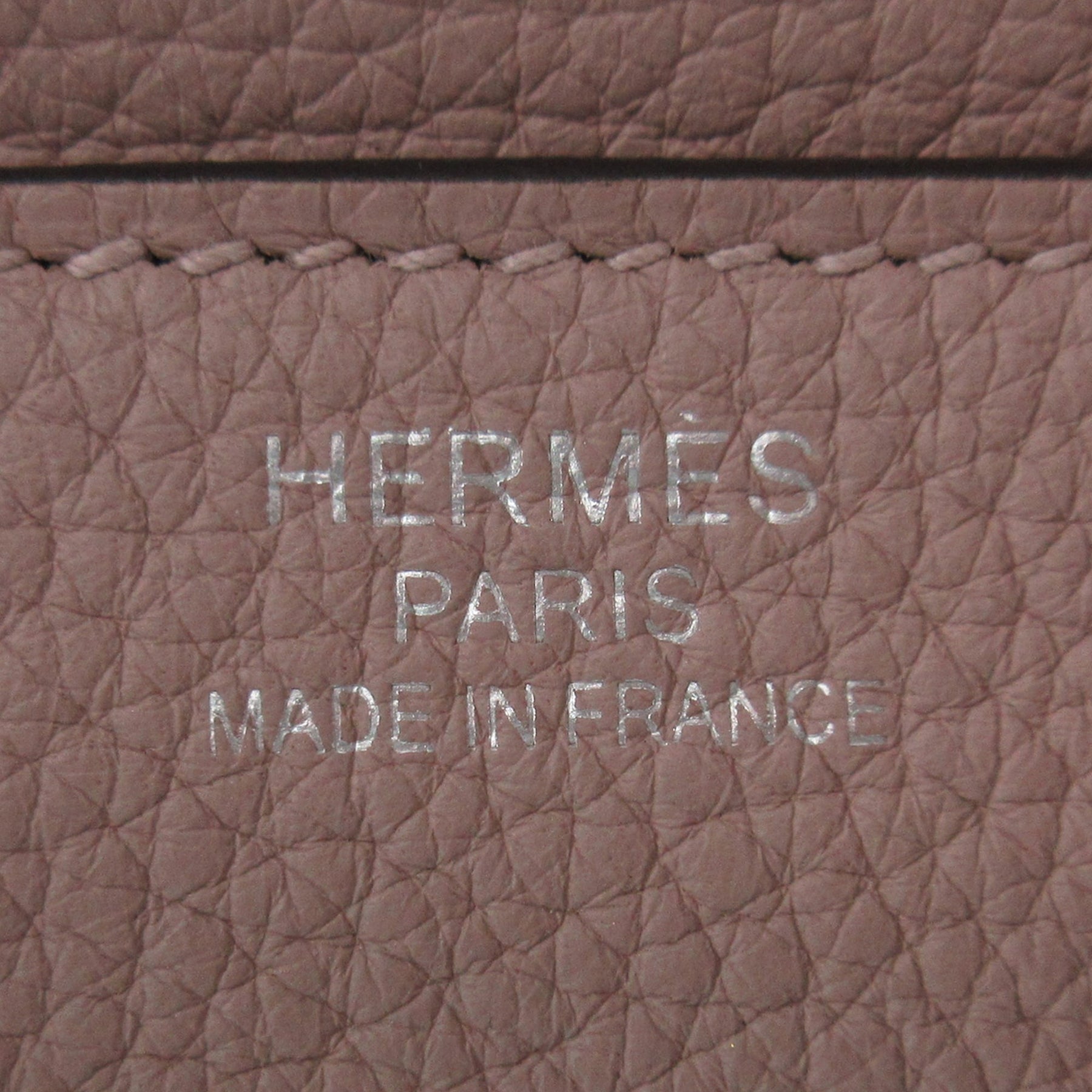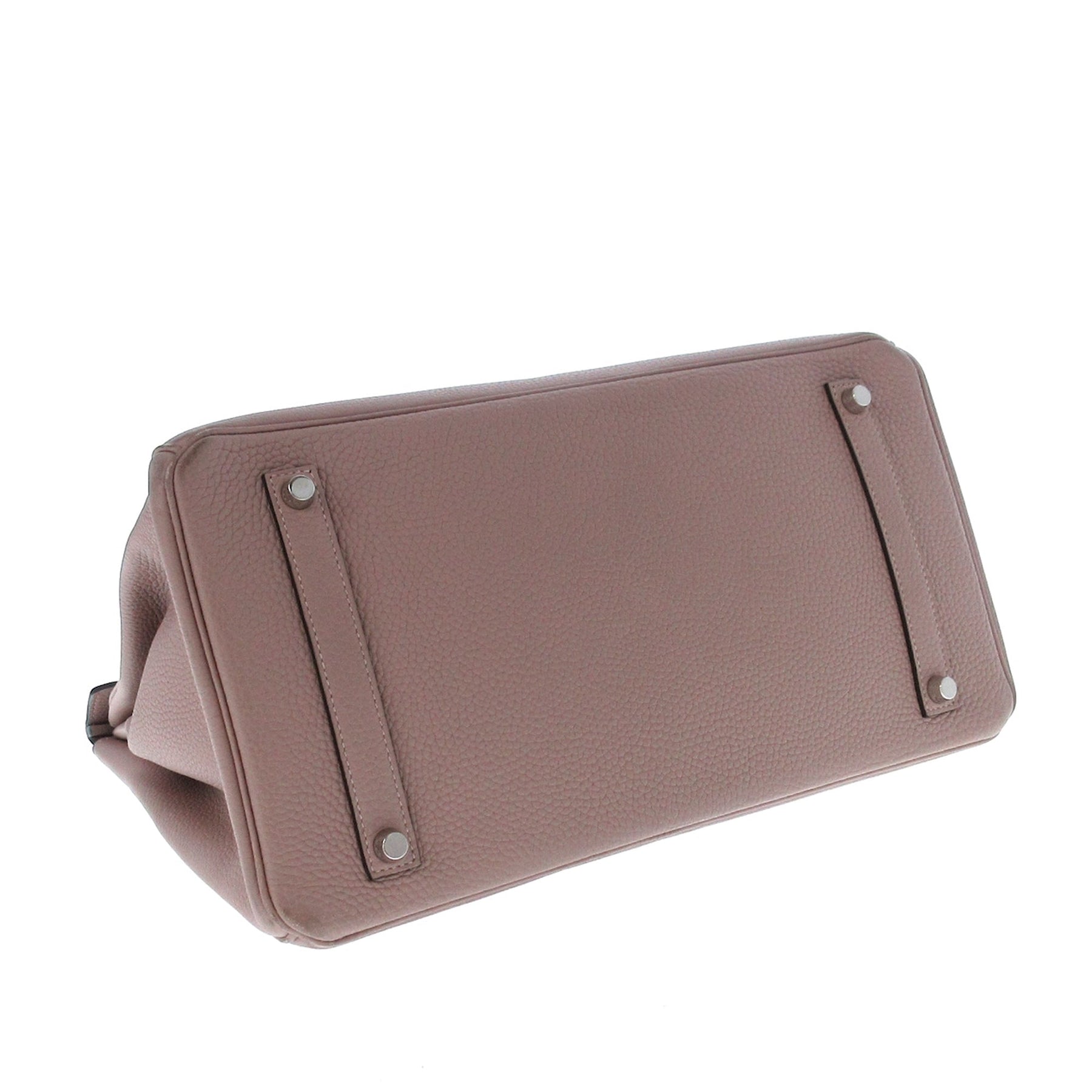 The Birkin 35 features a Clemence leather body in Glycine color, rolled leather handles, a front flap with turn-lock closure, and interior slip and zip pockets. Comes with dust bag