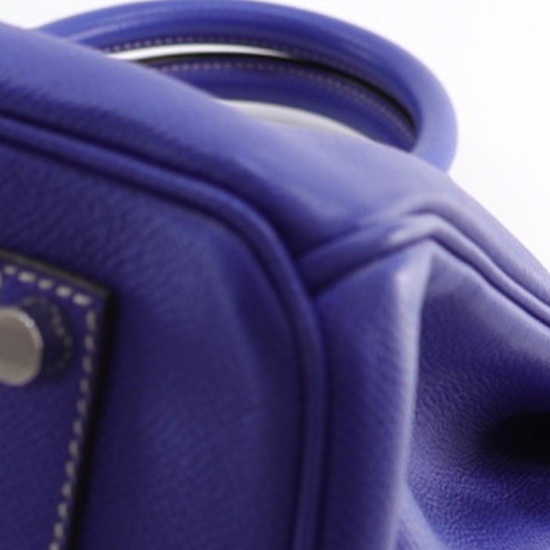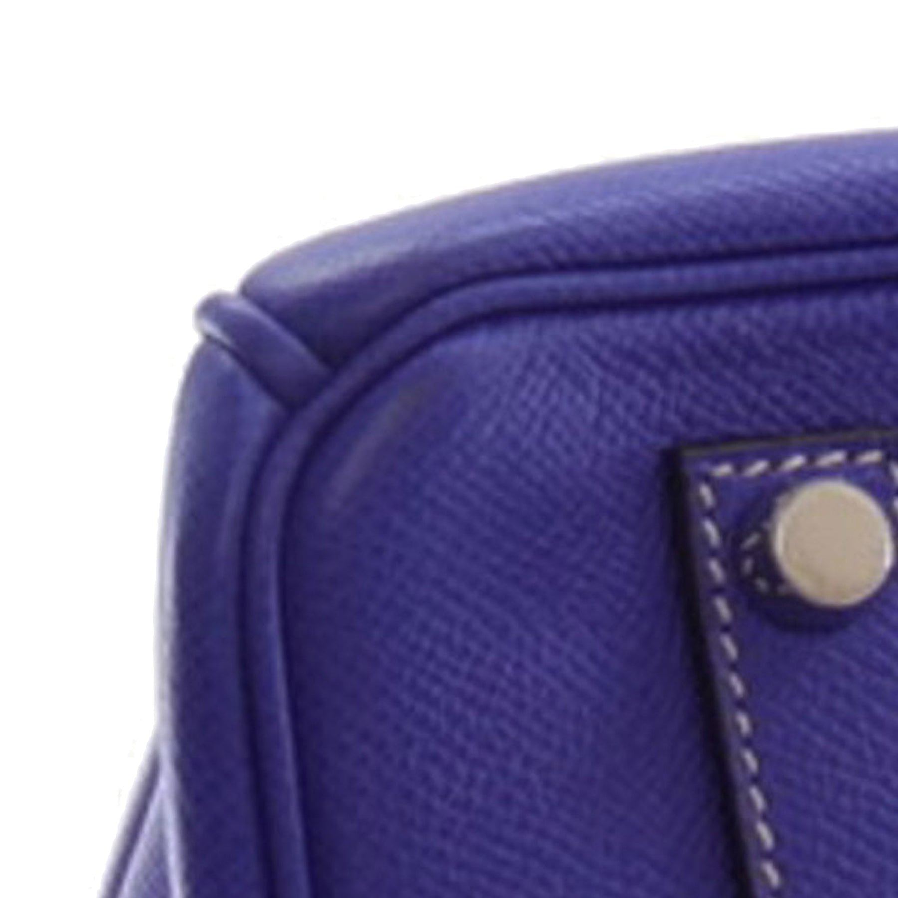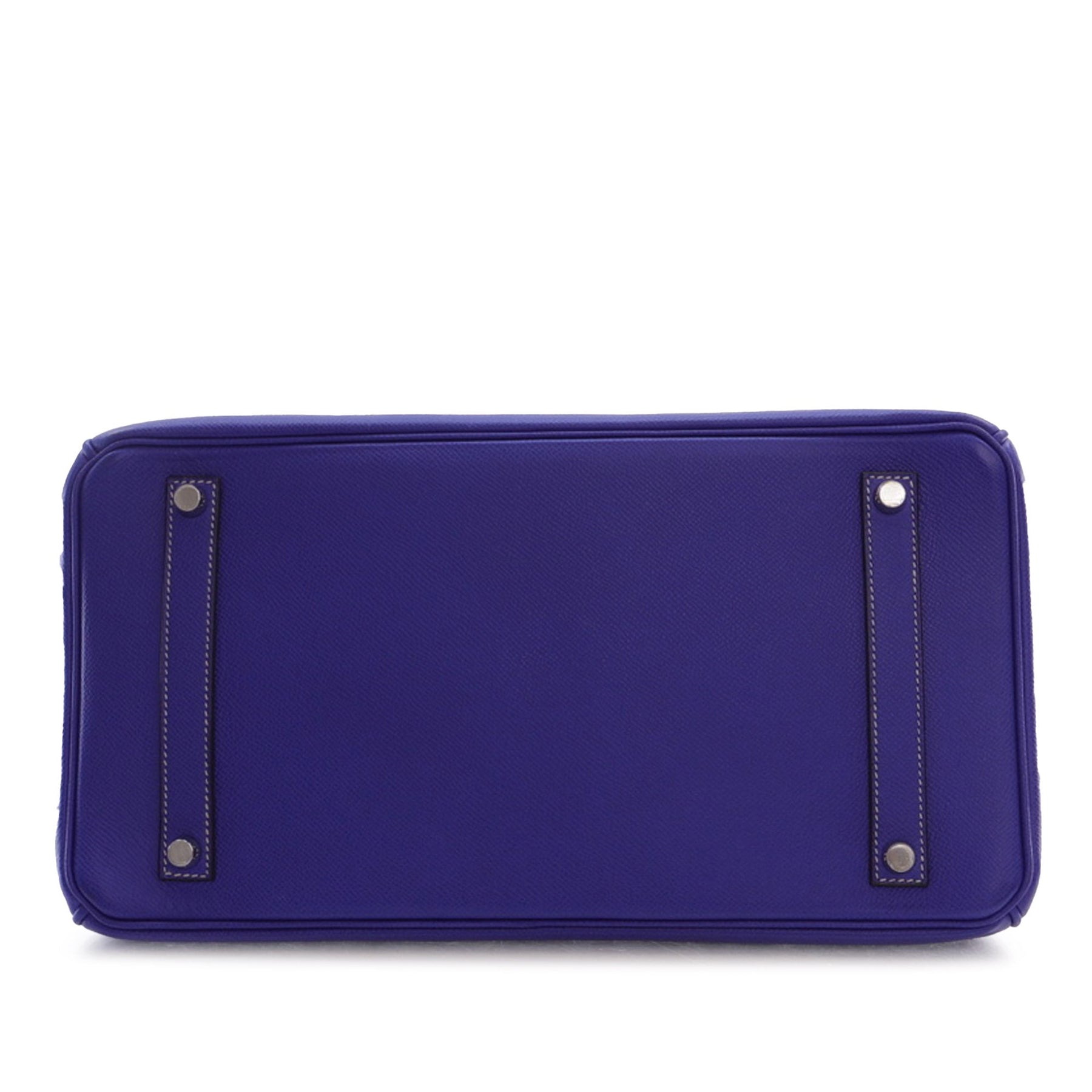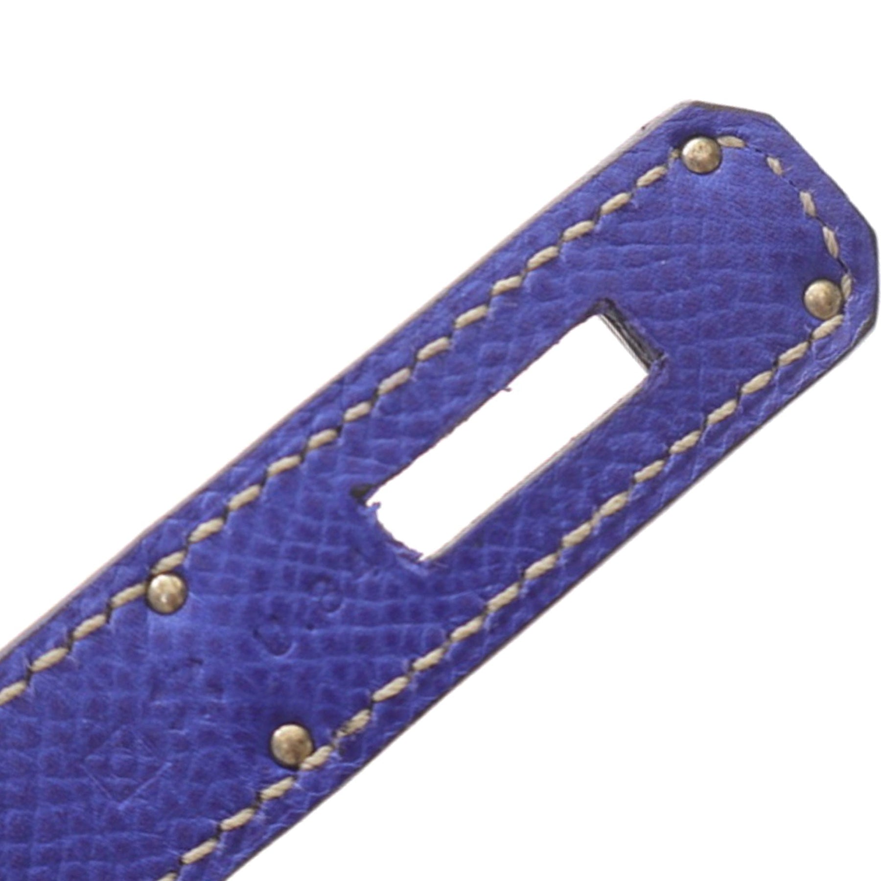 The Birkin 35 features an Epsom leather body in Bleu Electrique color, rolled leather handles, a front flap with turn-lock closure, and interior open and zip pockets.