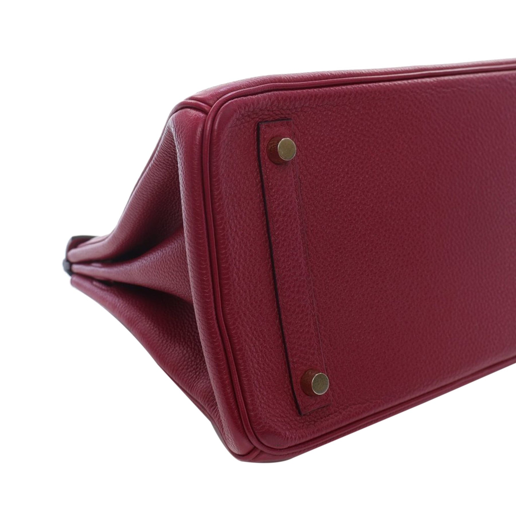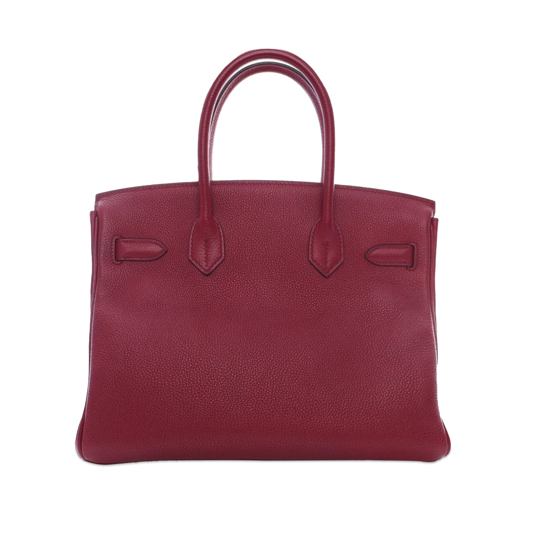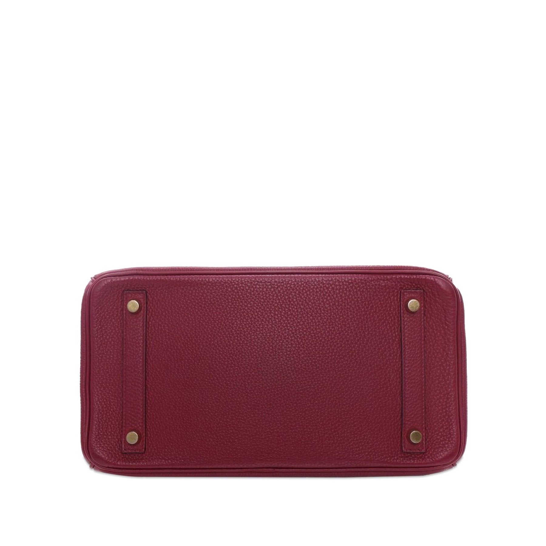 The Birkin 30 features a Togo leather body in Rouge Grenat color, rolled leather handles, a front flap with a metal lock closure, and interior zip and slip pockets. Comes with dust bag