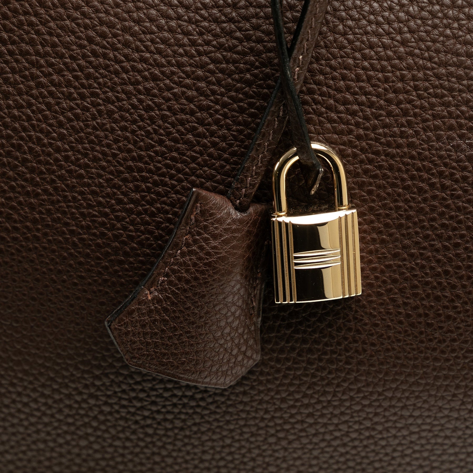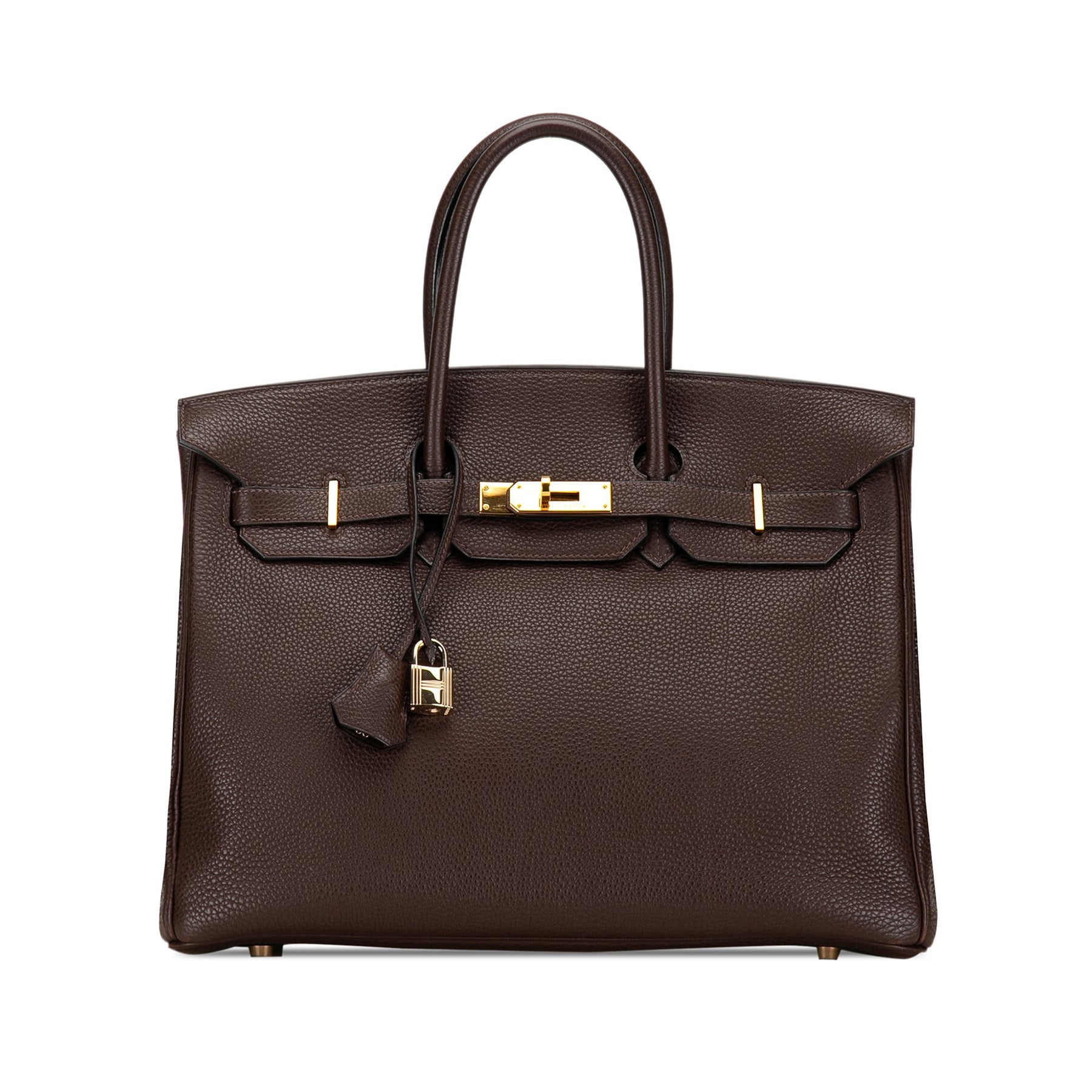 The Birkin 35 features a Togo leather body in Chocolate color, rolled leather handles, a front flap with turn-lock closure, and interior slip and zip pockets. Comes with dust bag