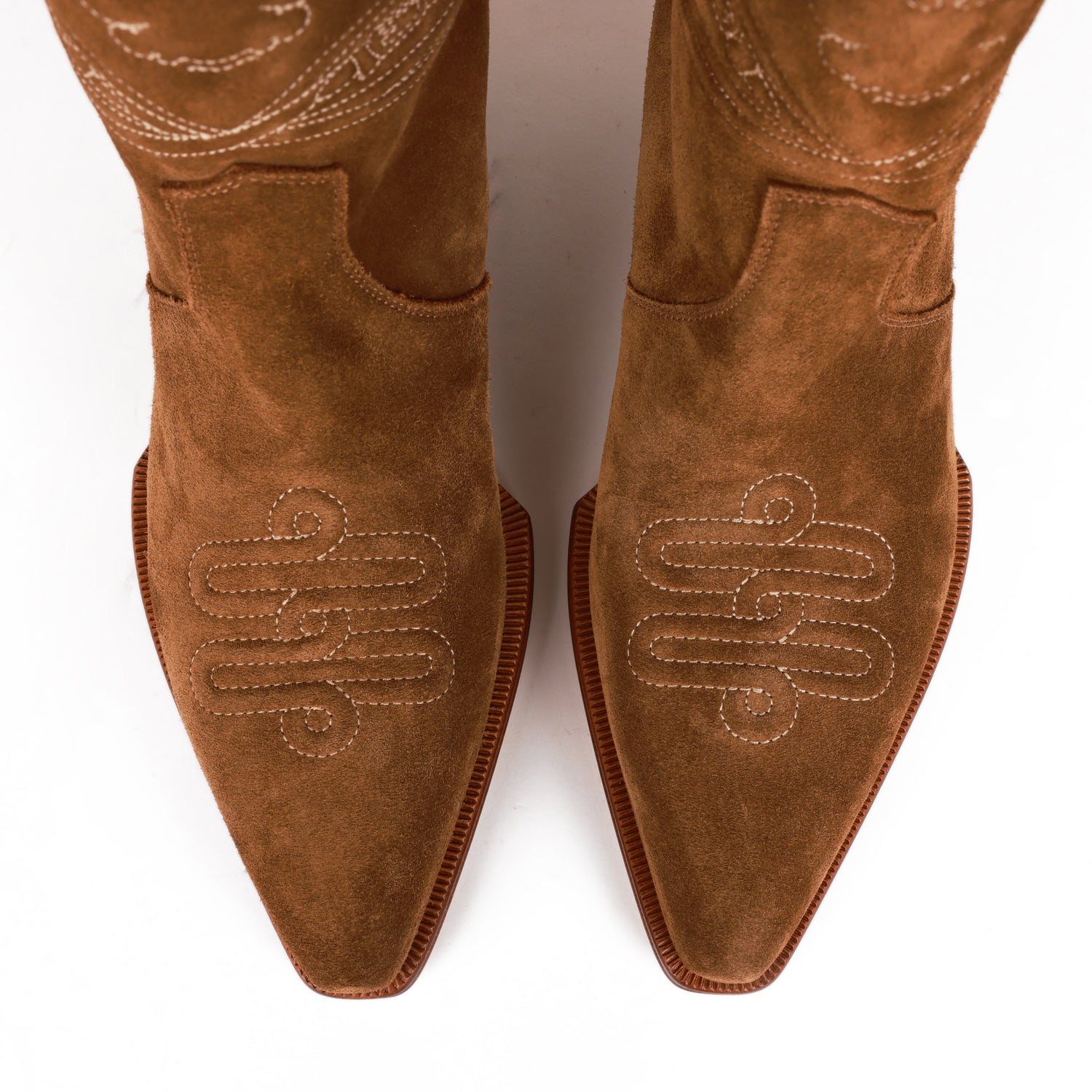 This pair of "Folk 35" Cowboy Boots are in brown suede with contrast "Brides de Gala" embroidery, tonal stitching and feature a brown leather sole and heel.