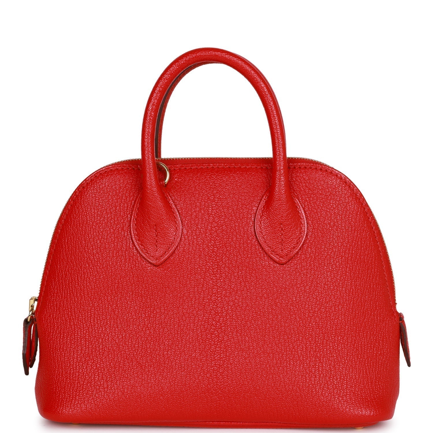 This Mini 1923 Bolide is in Rouge de Coeur chevre leather with gold hardware and has tonal stitching, a top zipper closure, double rolled handles and removable shoulder strap.