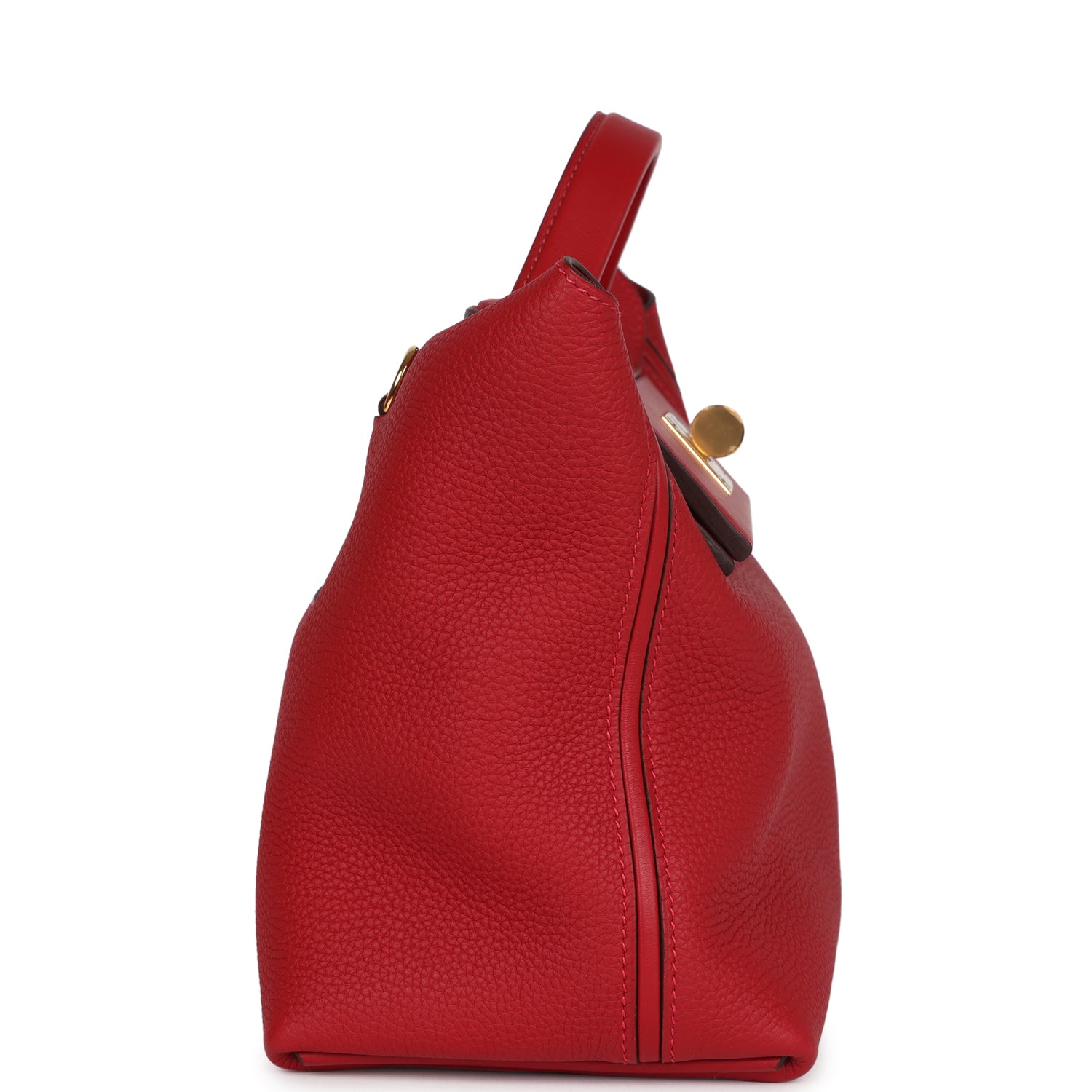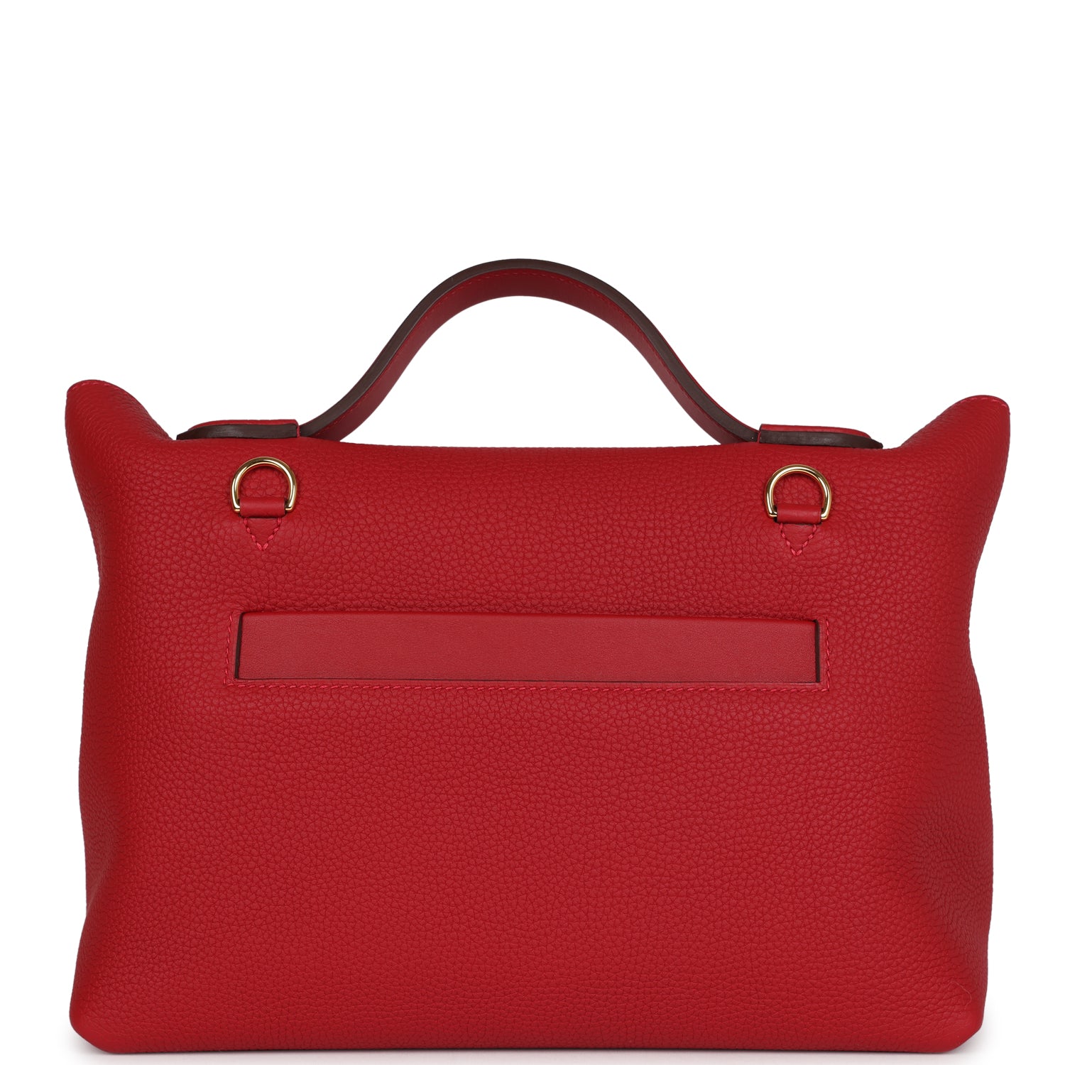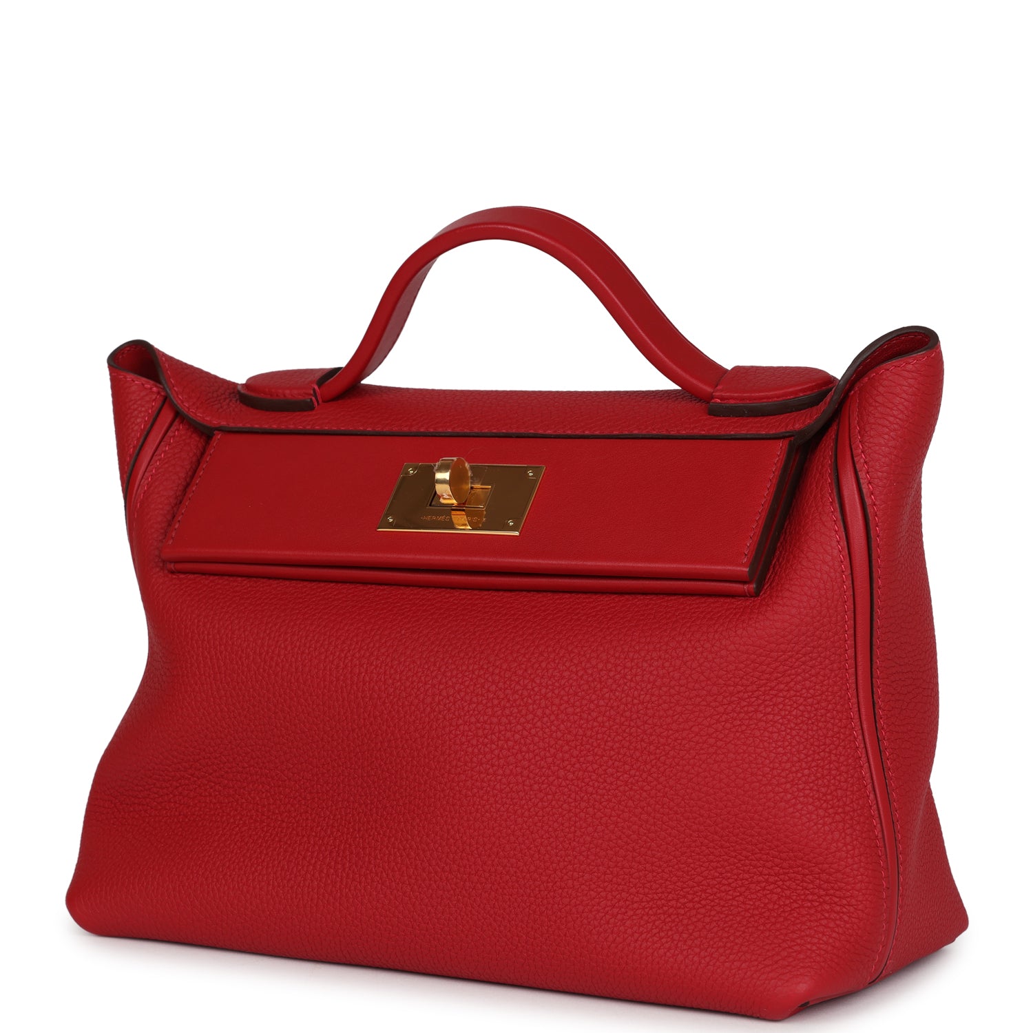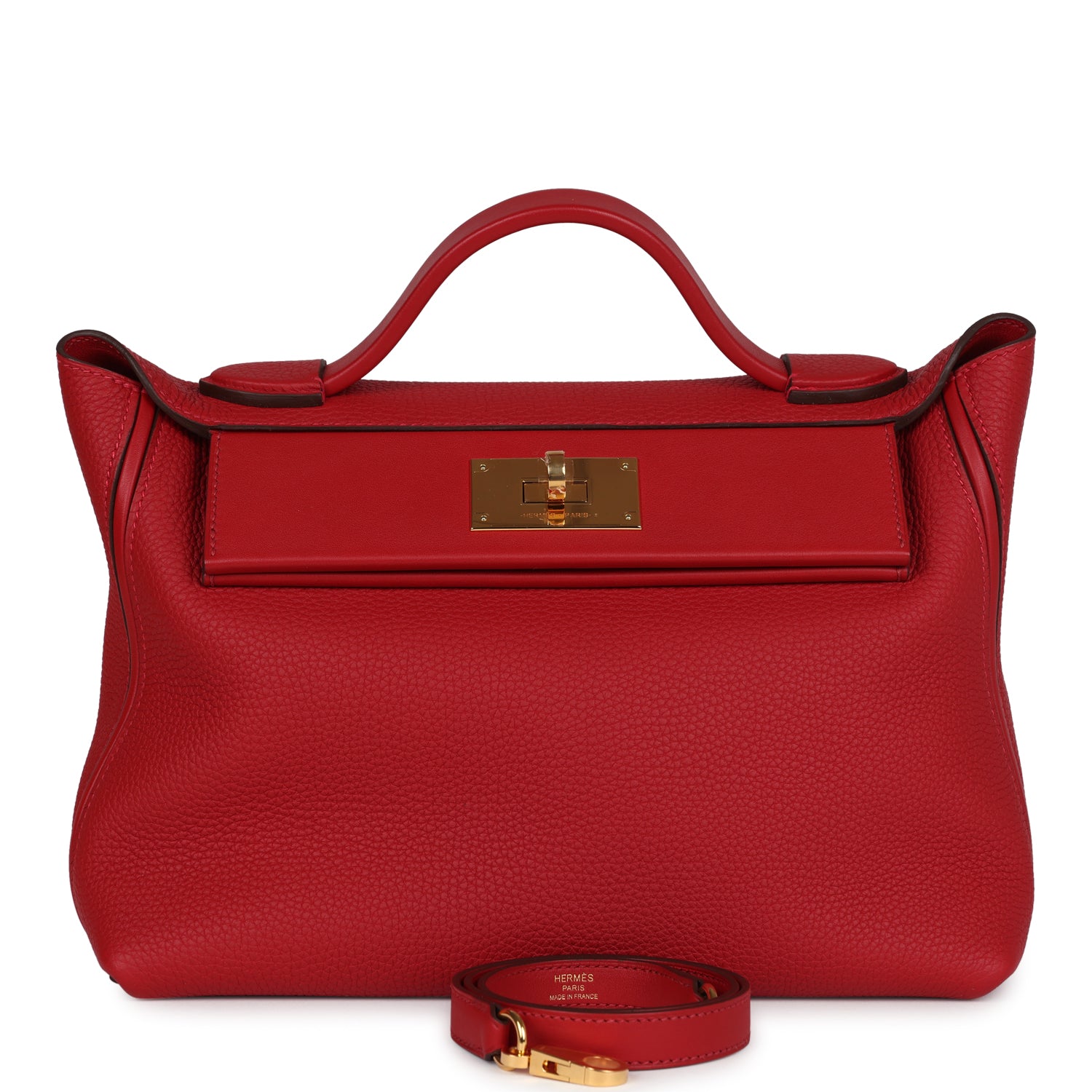 24/24 29 bag is in Rouge Vif Taurillon Maurice leather and Rouge Piment swift leather with gold hardware and has tonal stitching, front turnlock closure, open rear pocket, single flap top handle and removable shoulder strap.