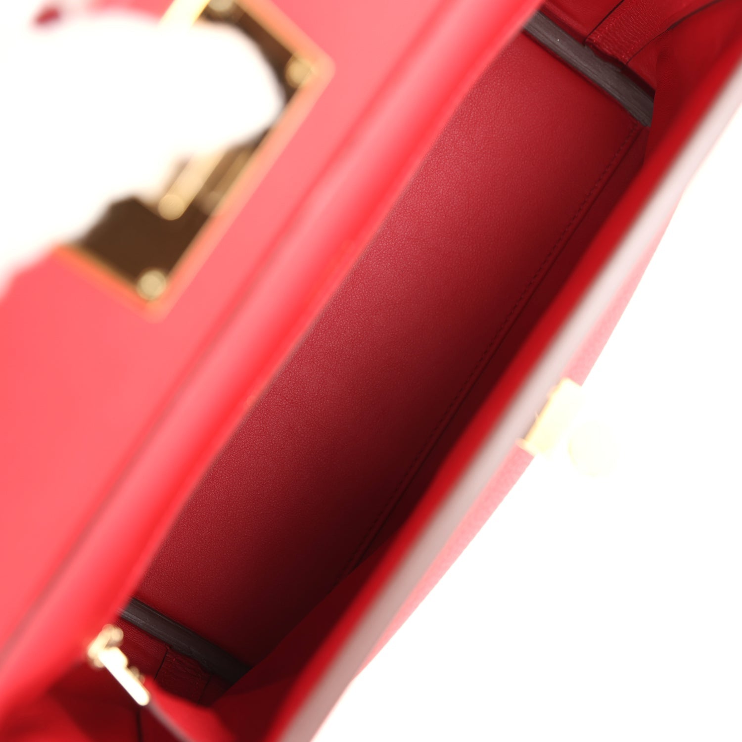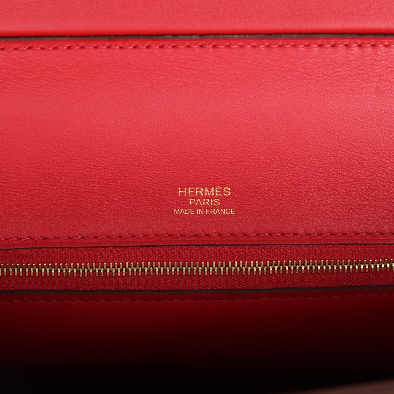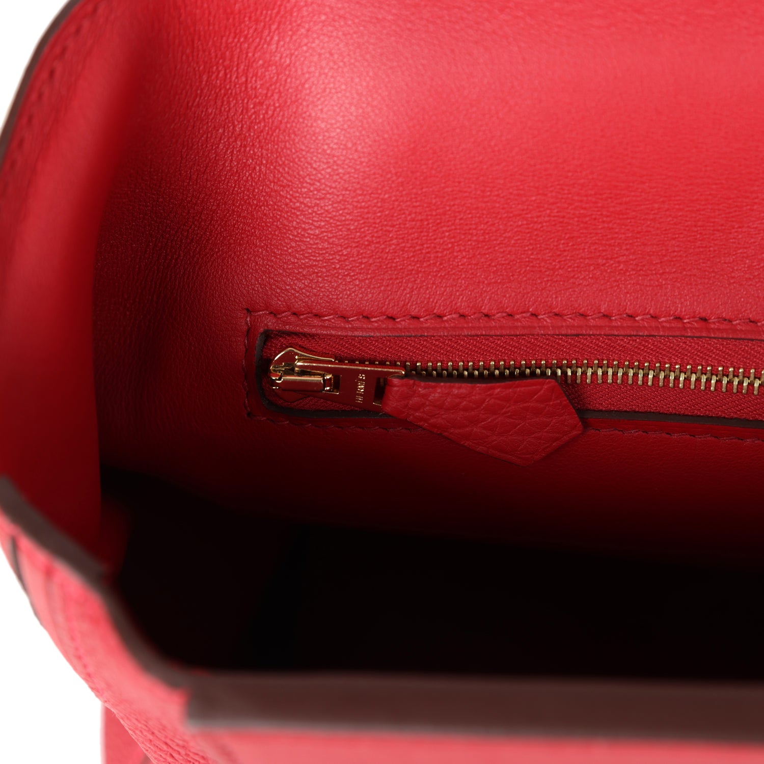 The interior is lined with Rouge Piment swift leather and has one zip pocket with an Hermes engraved pull on the back wall.
