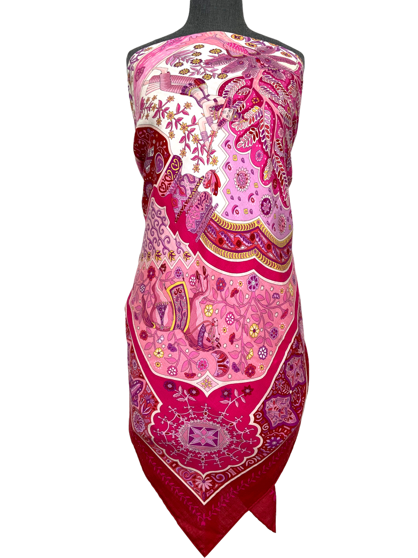 We the ity of this absolutely stunning and bursting with color Hermes Aux Portes du Palais Cashmere Shawl Scarf 140 designed by Christine Henry which was first issued in 2008. This gorgeous scarf features vibrant red and pink hues with hand-rolled edges.