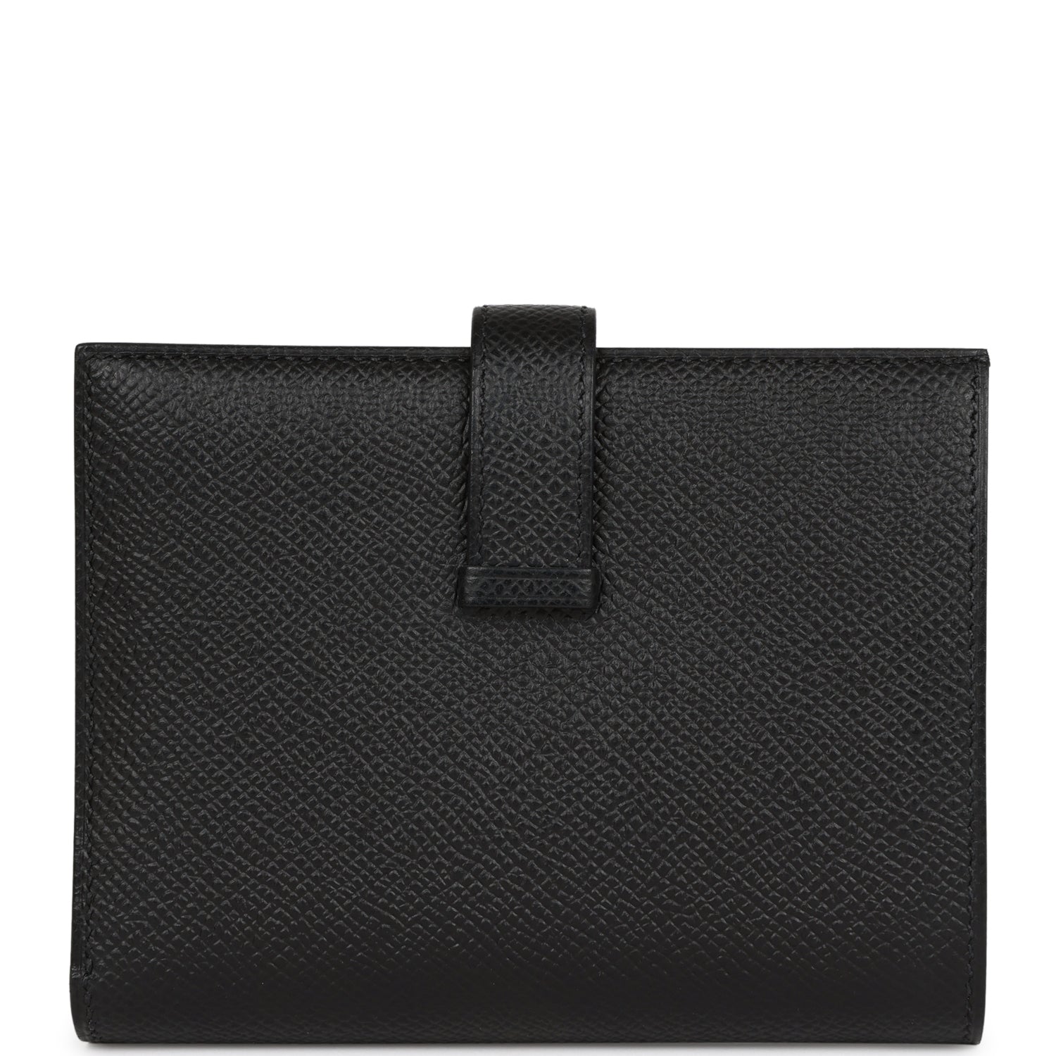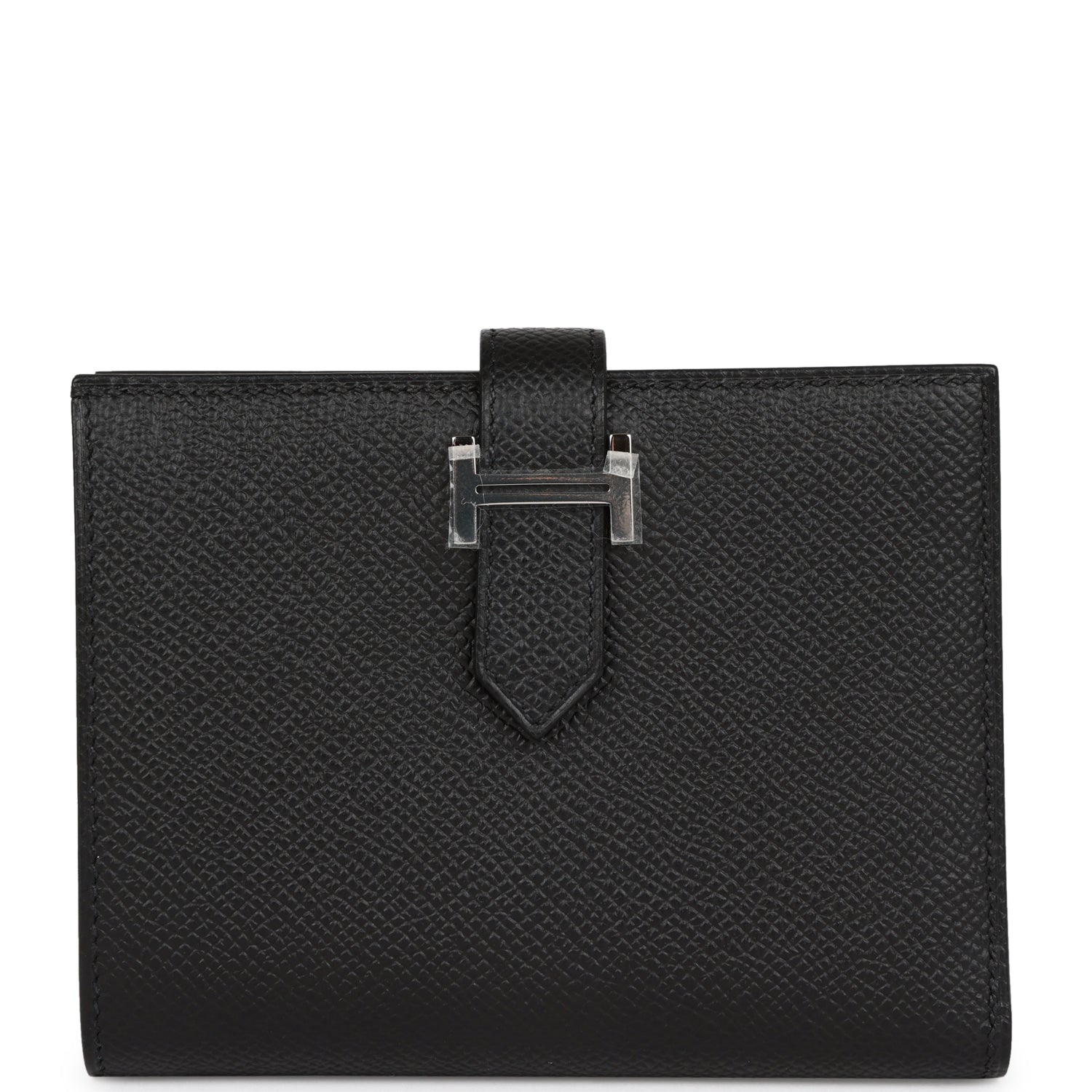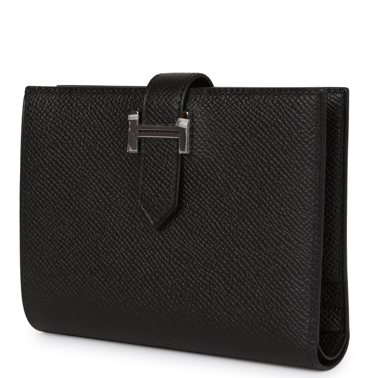 This Bearn Compact Wallet is in Black epsom leather with palladium hardware, tonal stitching, and a loop closure that tucks into a palladium H.