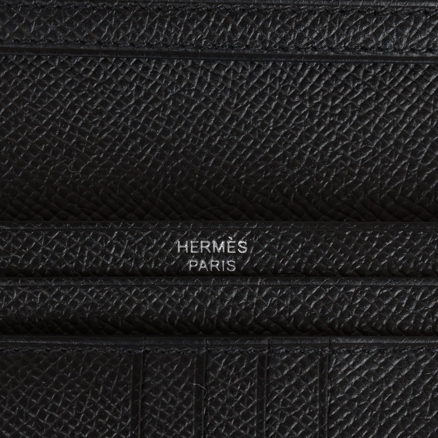 The interior is lined with black epsom leather with four credit card slots, four slip pockets, and a zippered change purse with snap closure.