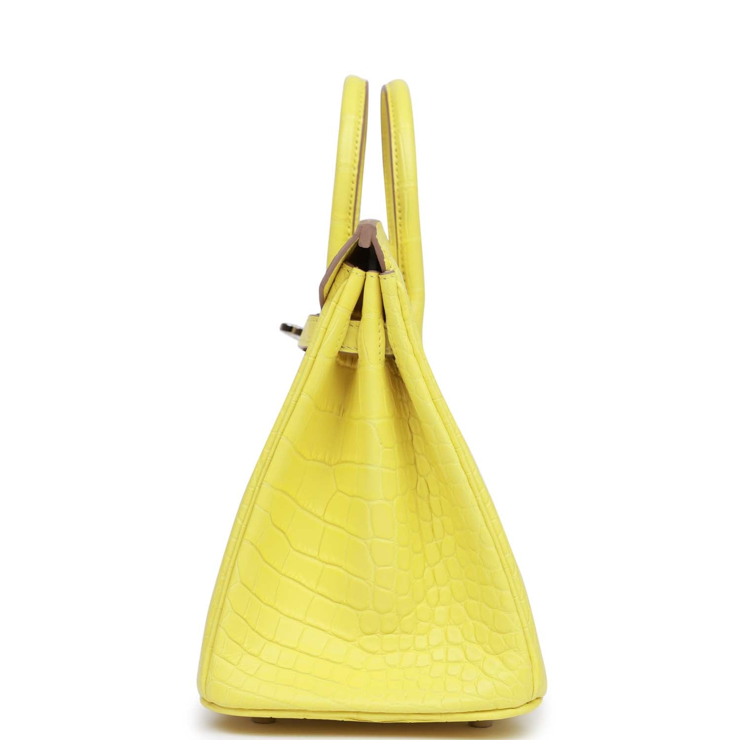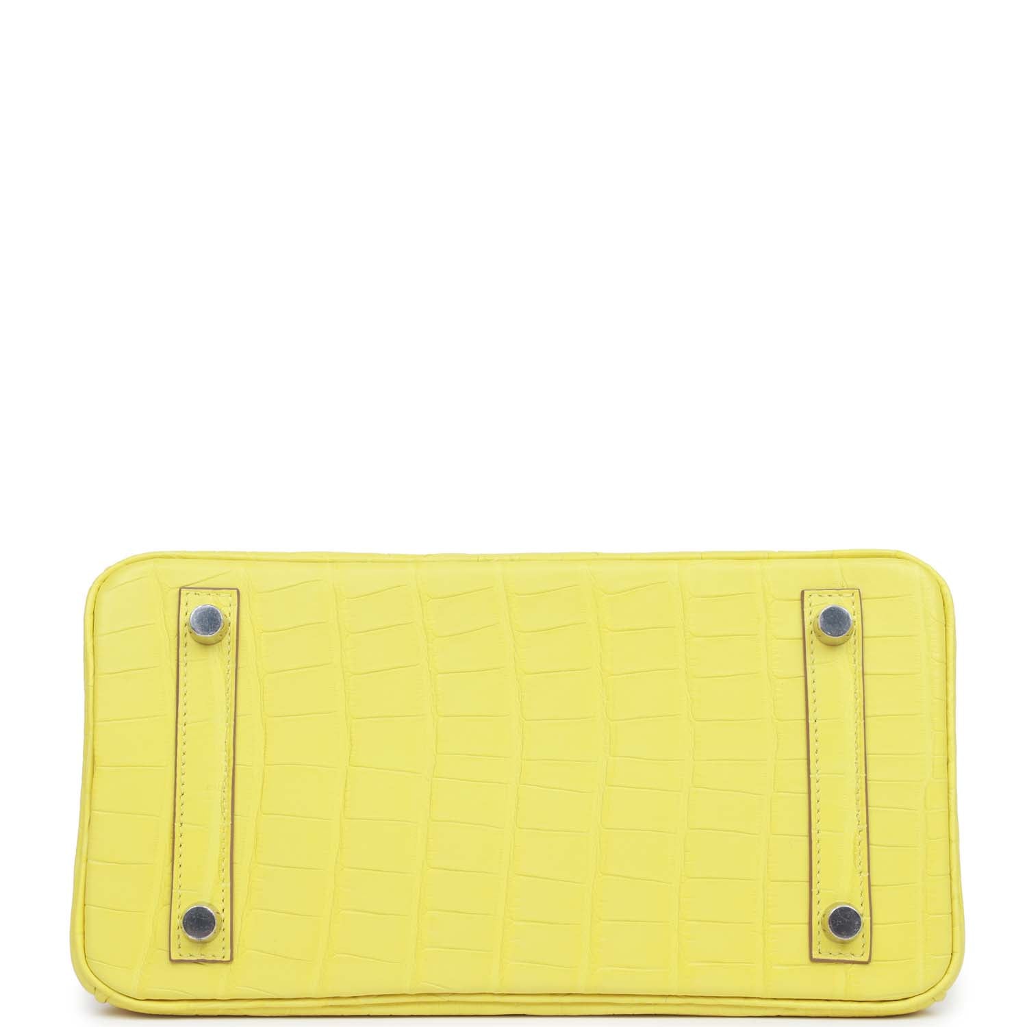 This Birkin is in Lime Mississippiensis Matte Alligator leather with palladium hardware, has tonal stitching, front flap, two straps with center toggle closure, clochette with lock and two keys, and double rolled handles.