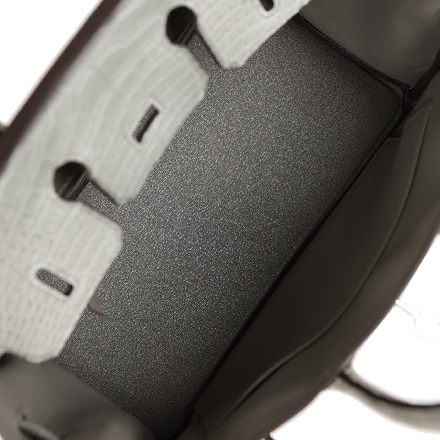 This Birkin, is a Touch in Gris Meyer and Gris Ciment Togo and Matte Alligator leather with palladium Hardware, tonal stitching, front flap with two straps, front toggle closure, clochette with lock and two keys and double rolled handles.