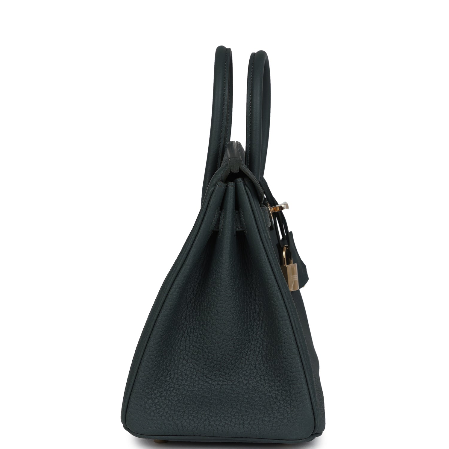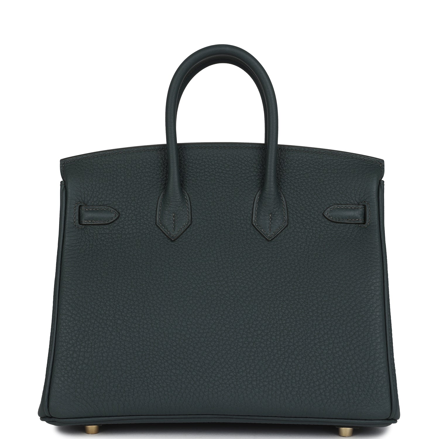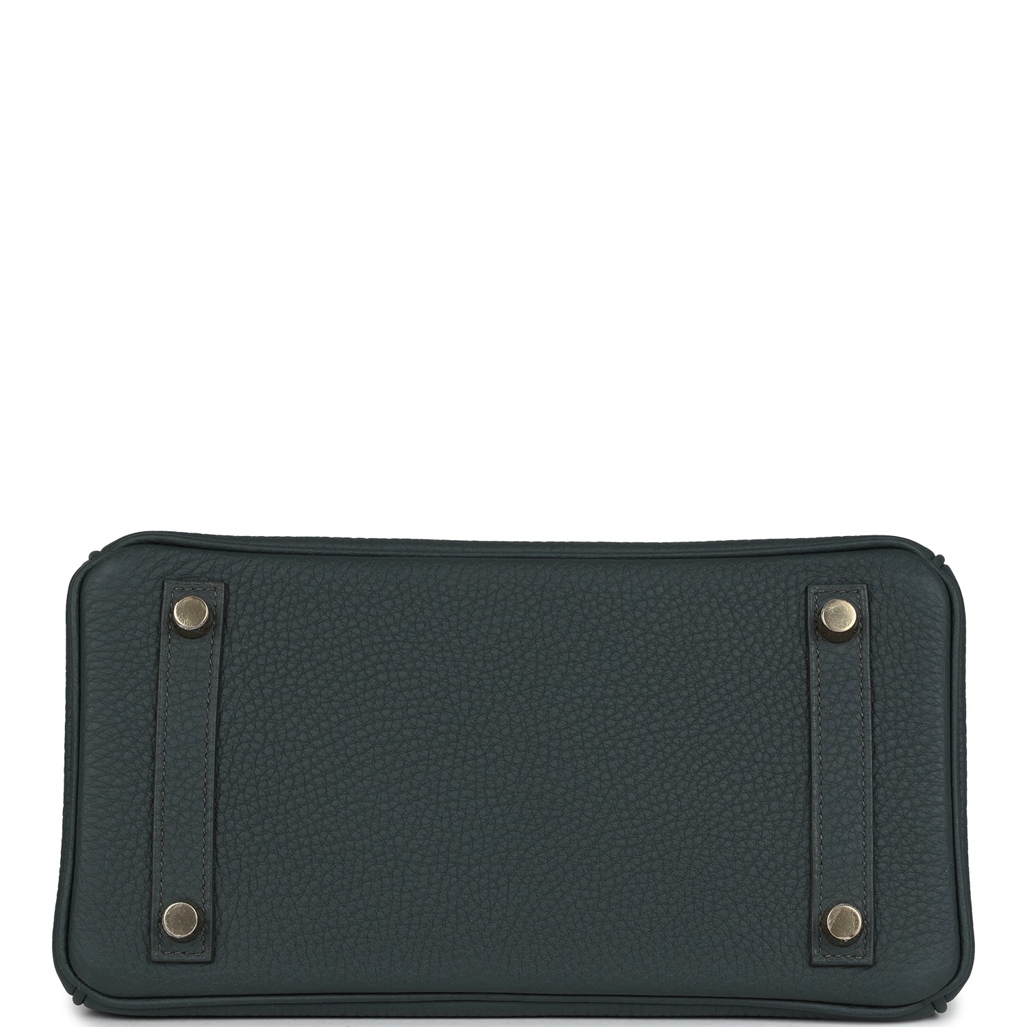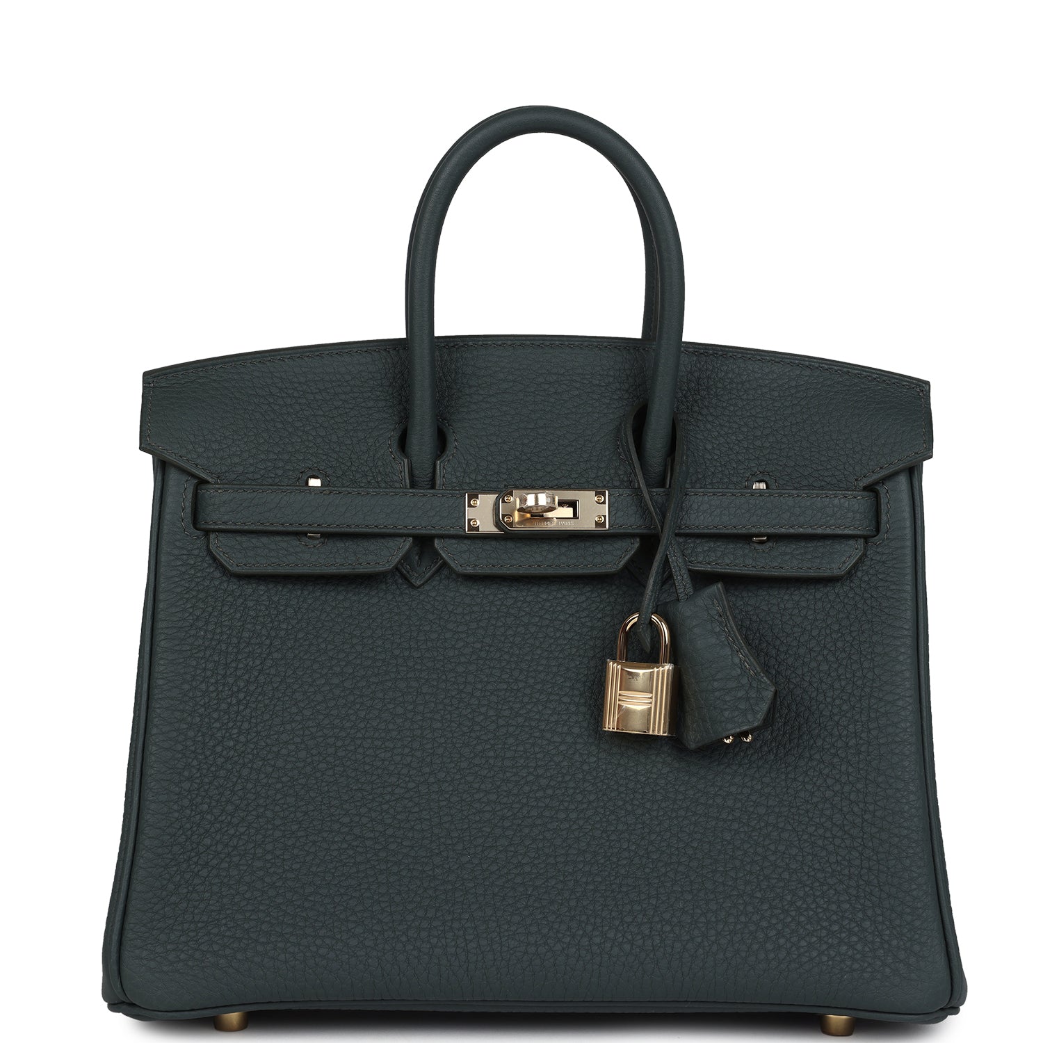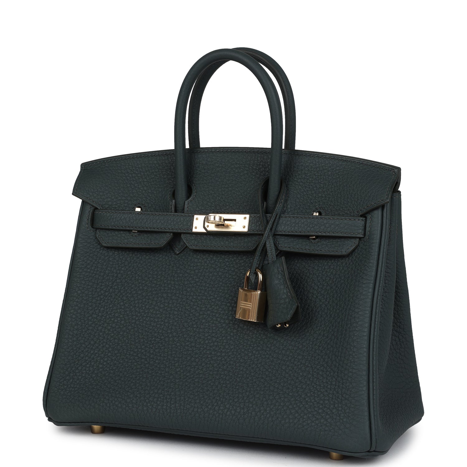 Birkin is in Vert Mangrove togo leather with permabrass hardware, has tonal stitching, front flap, two straps with center toggle closure, clochette with lock and two keys, and double rolled handles.