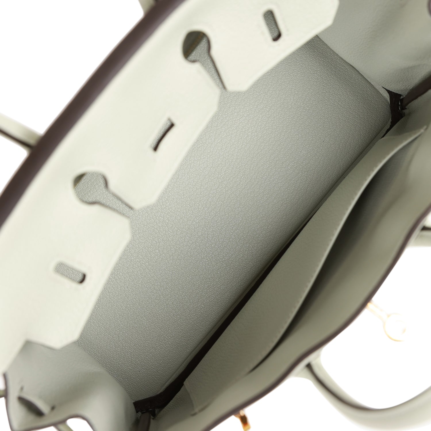 This Birkin is in Gris Neve togo leather with gold hardware and has tonal stitching, two straps with front toggle closure, clochette with lock and two keys and double rolled handles.