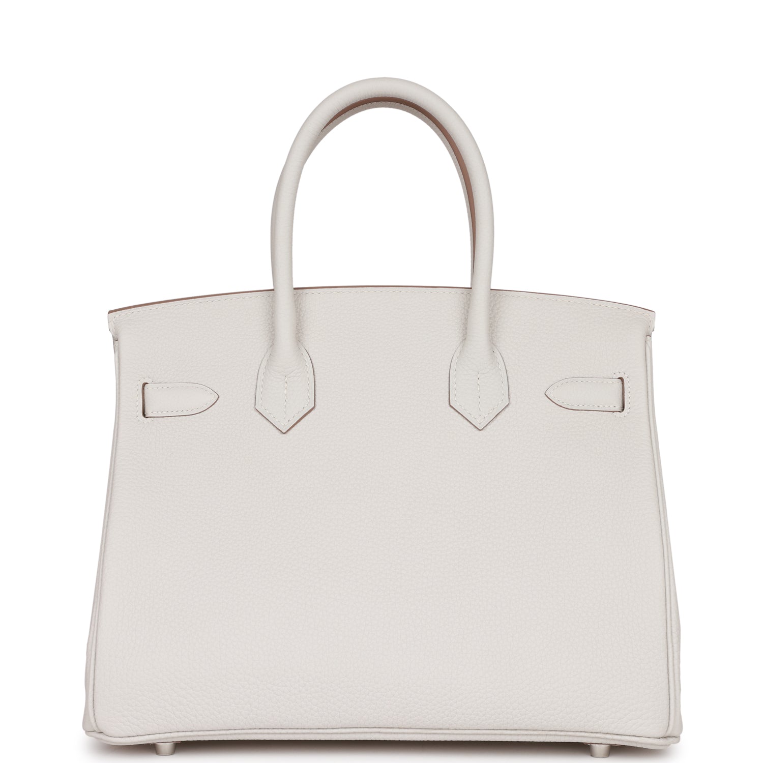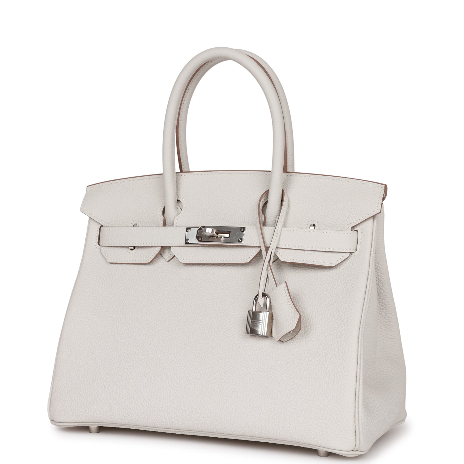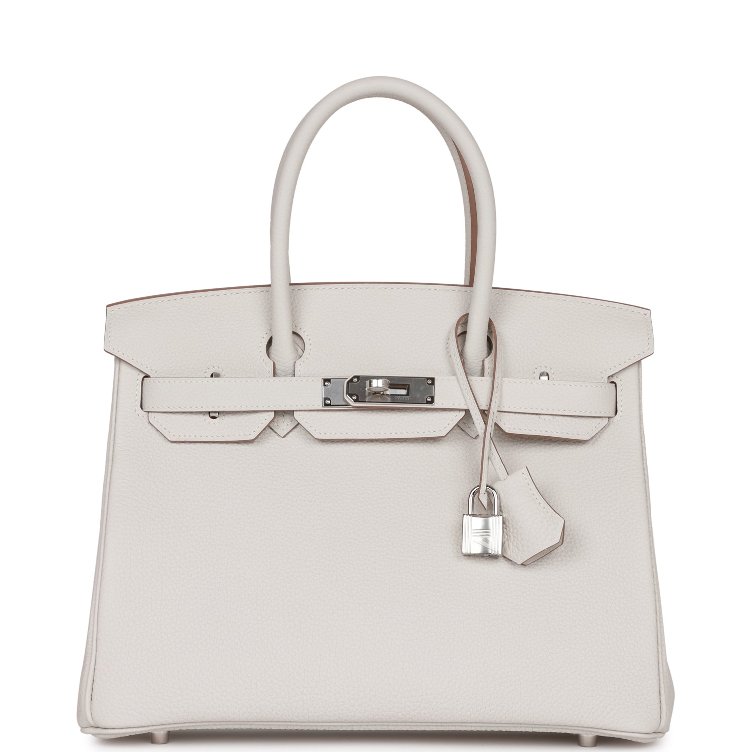 This Birkin is in Gris Pale togo leather with palladium hardware and has tonal stitching, front flap, two straps with center toggle closure, clochette with lock and two keys, and double rolled handles.