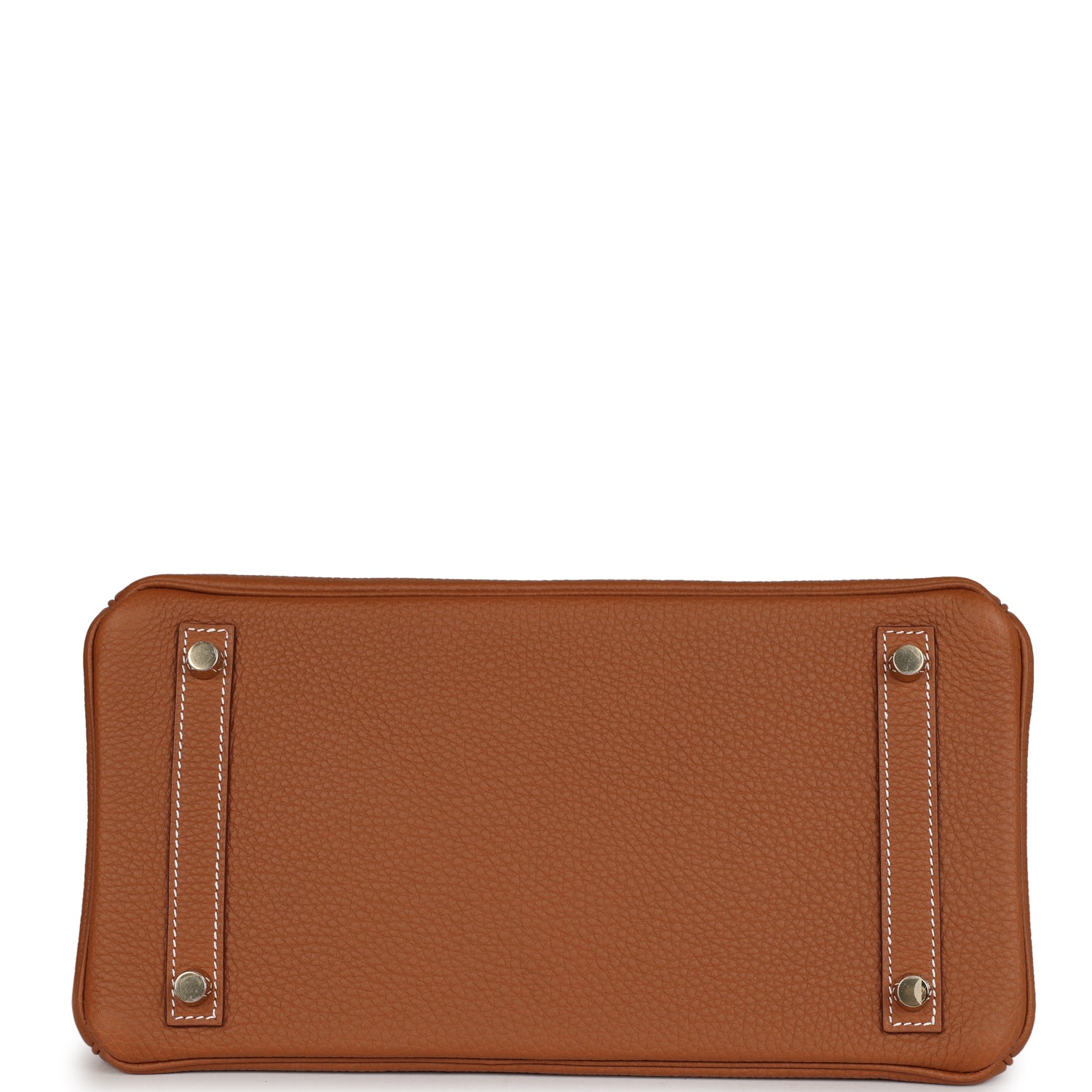 This Birkin 30, in the Retourne style is in Gold Togo with Gold Hardware, contrast stitching, front flap with two straps, front toggle closure, clochette with lock and two keys, and double rolled handles