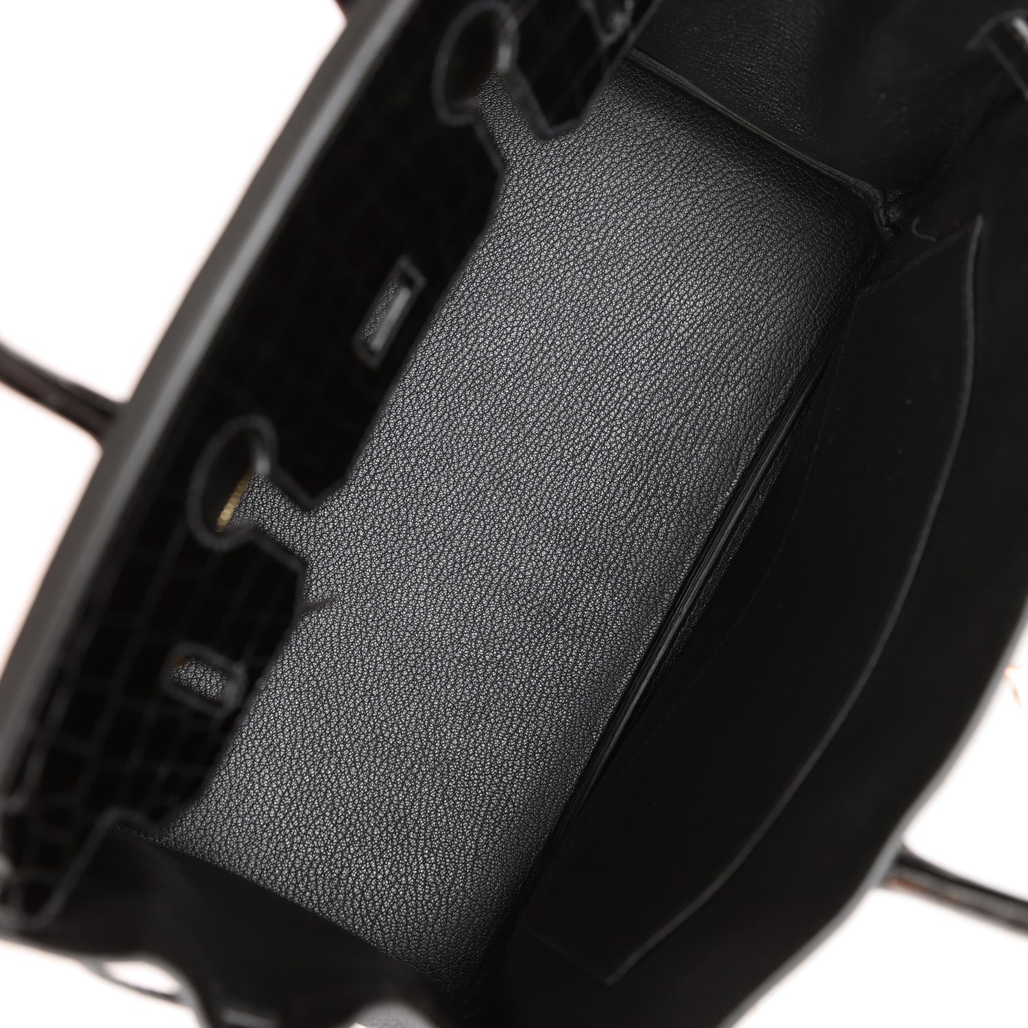This Birkin "Touch" is in Black Niloticus crocodile and black togo leather with rose gold hardware and has tonal stitching, two straps with front toggle closure, clochette with lock and two keys and double rolled crocodile handles.