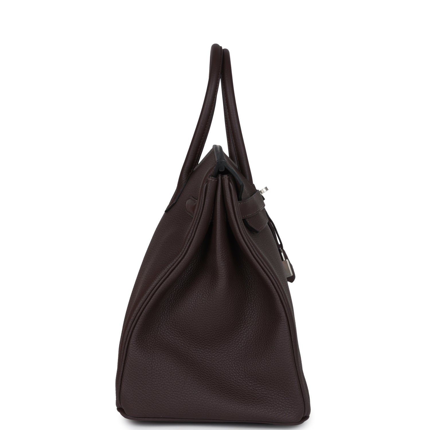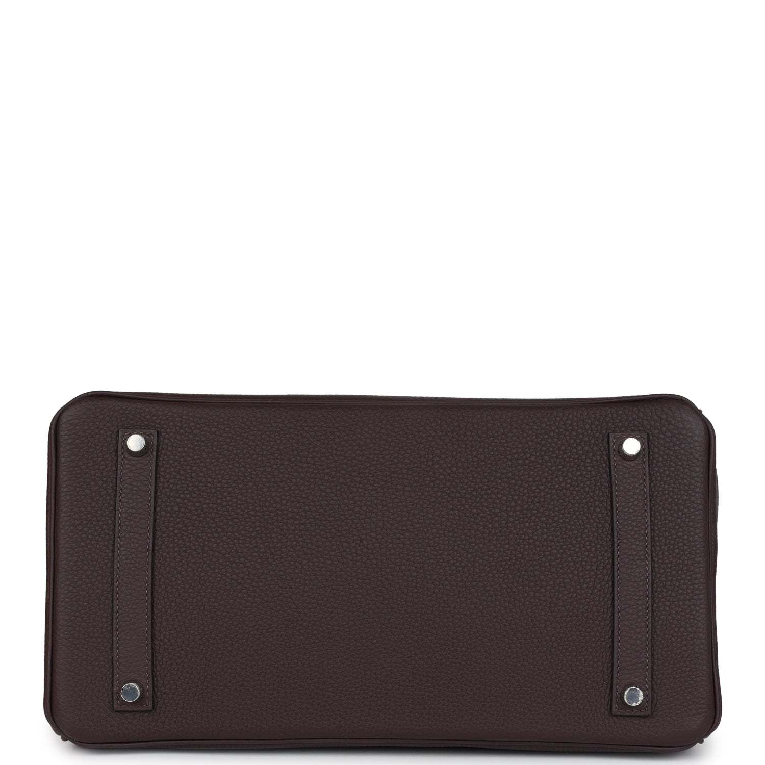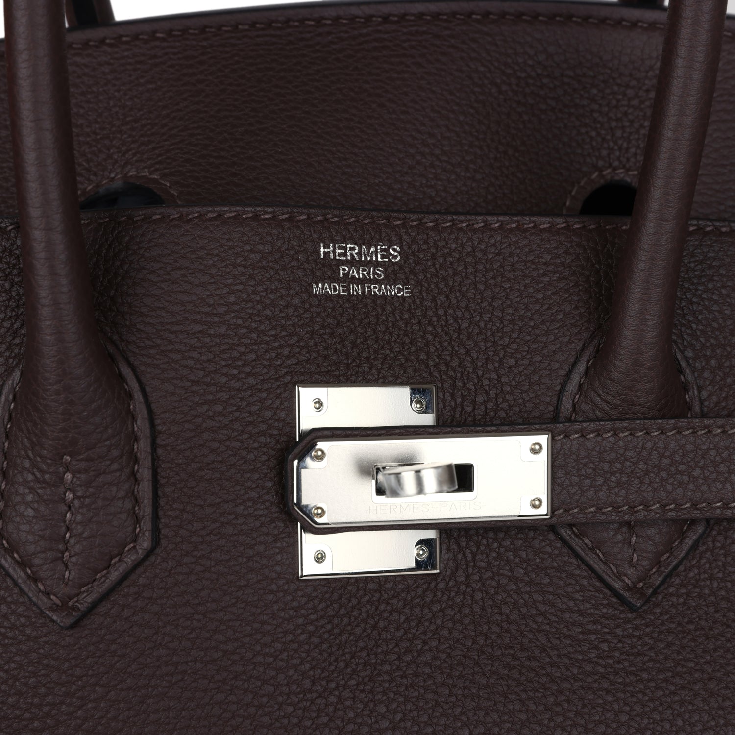 Birkin is in Chocolat togo leather with palladium hardware, tonal stitching, front flap with two straps, front toggle closure, clochette with lock and two keys, double rolled handles