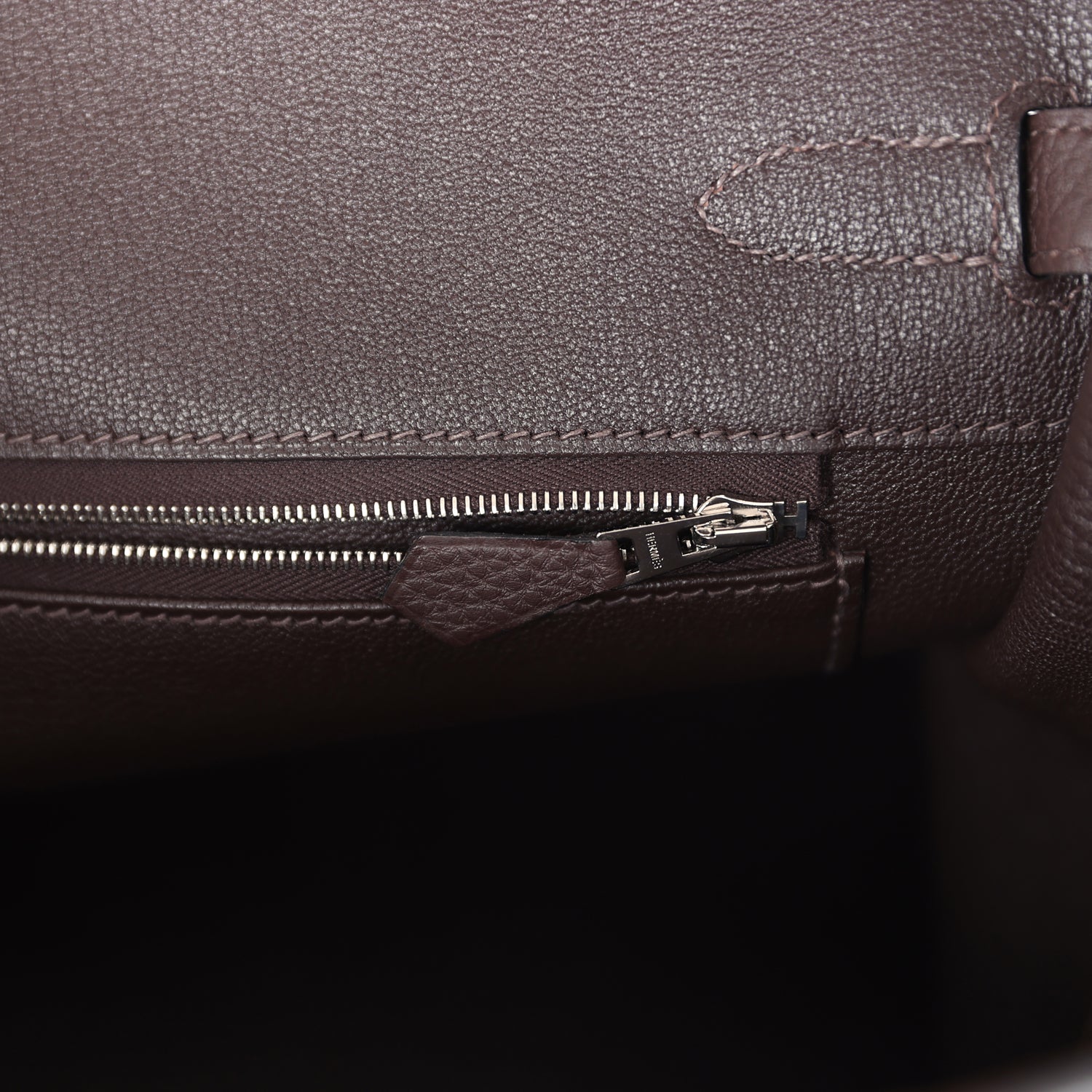 The interior is lined with Chocolat chevre and has one zip pocket with an Hermes engraved zipper pull and an open pocket on the opposite side.