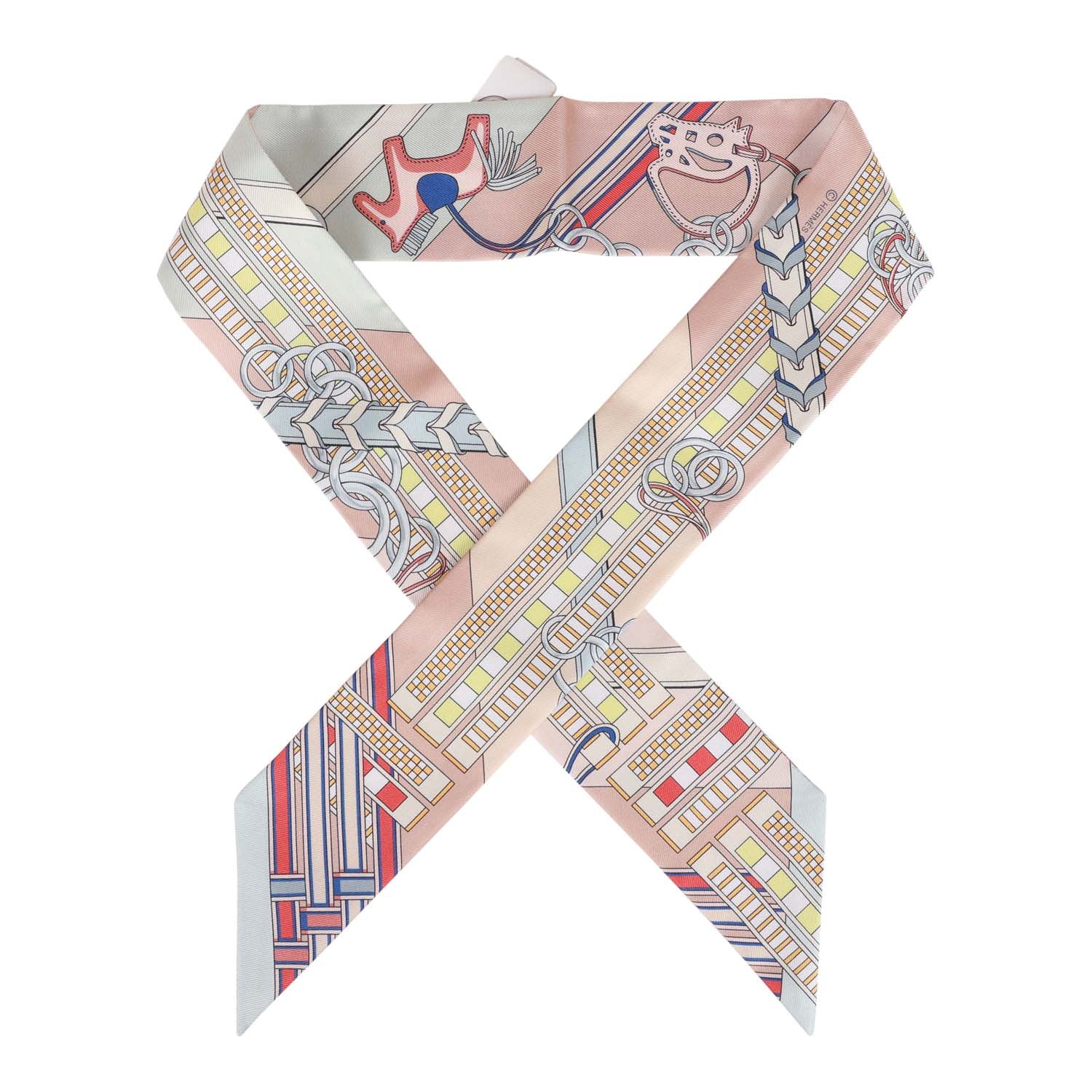 Hermes "Brides Et Gris" twilly pair of silk twill designed by Hugo Grygkar in a pink colorway.