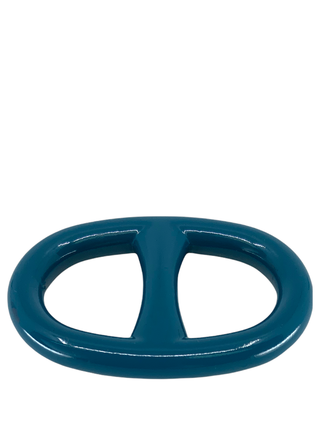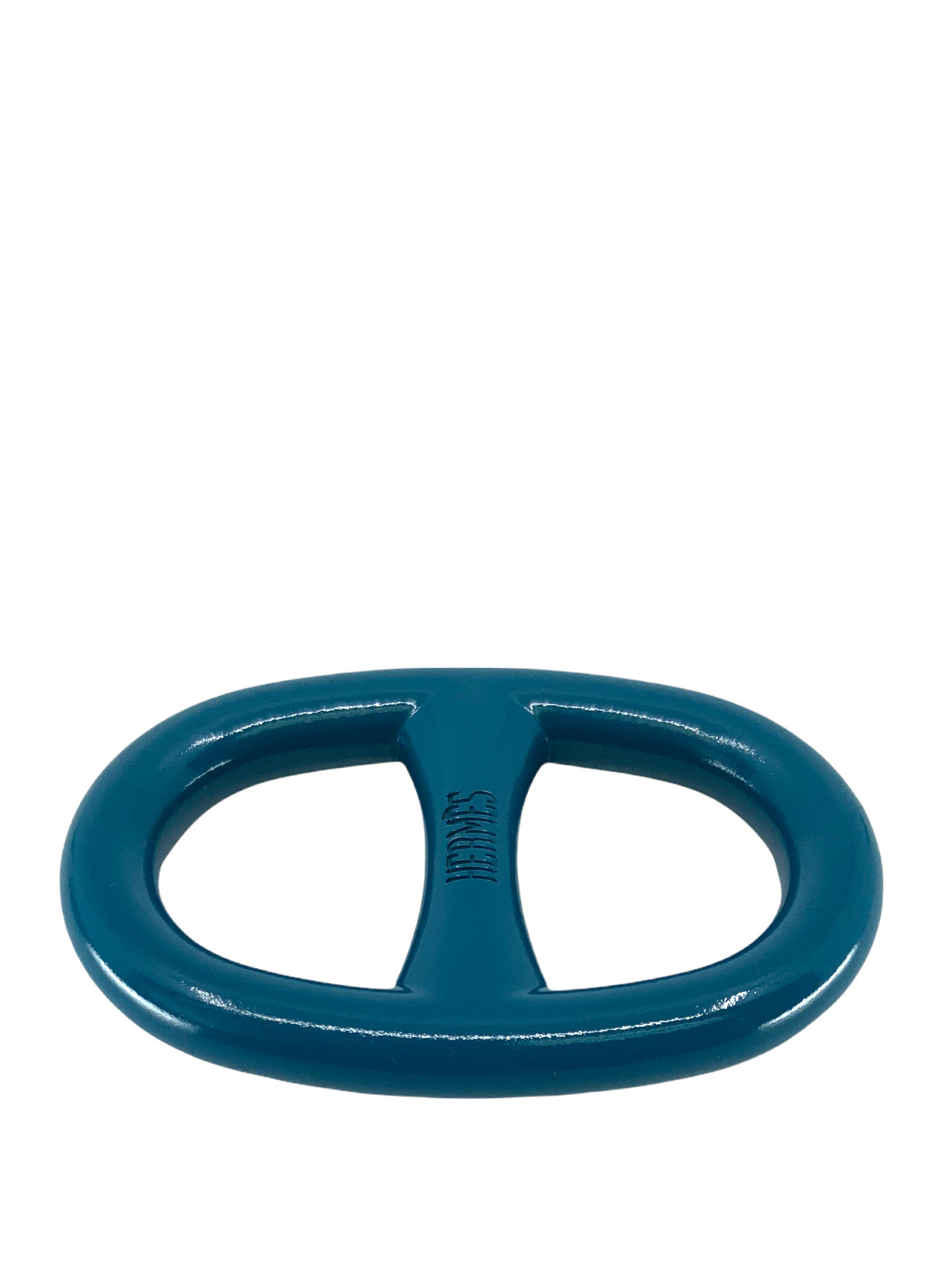 This highly sought after HERMES Chaine D'Ancre Scarf Ring makes for a perfect addition to any scarf. Featuring teal blue metal with a signature logo-engraving at center. Wear this to secure your scarf in place and to add a touch of style to your wardrobe.