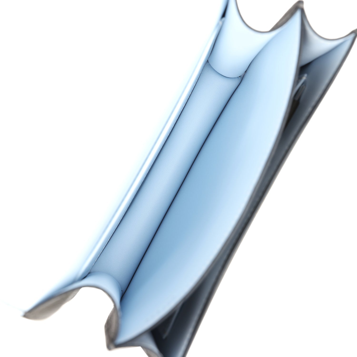 The interior is lined with Vert Maquis and Bleu Brume lambskin and has an open pocket on the front wall, a center divide, removable mirror and a slit pocket on the back wall.