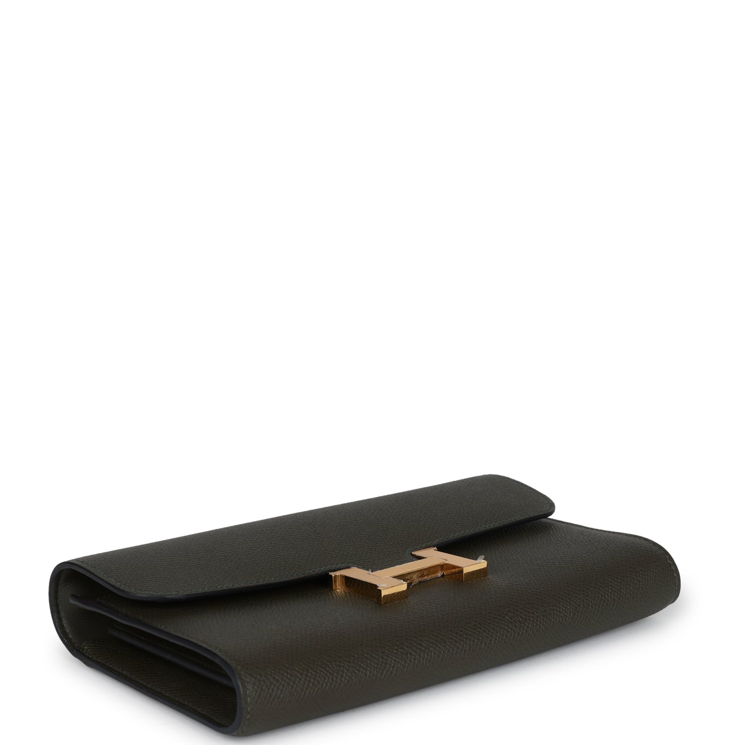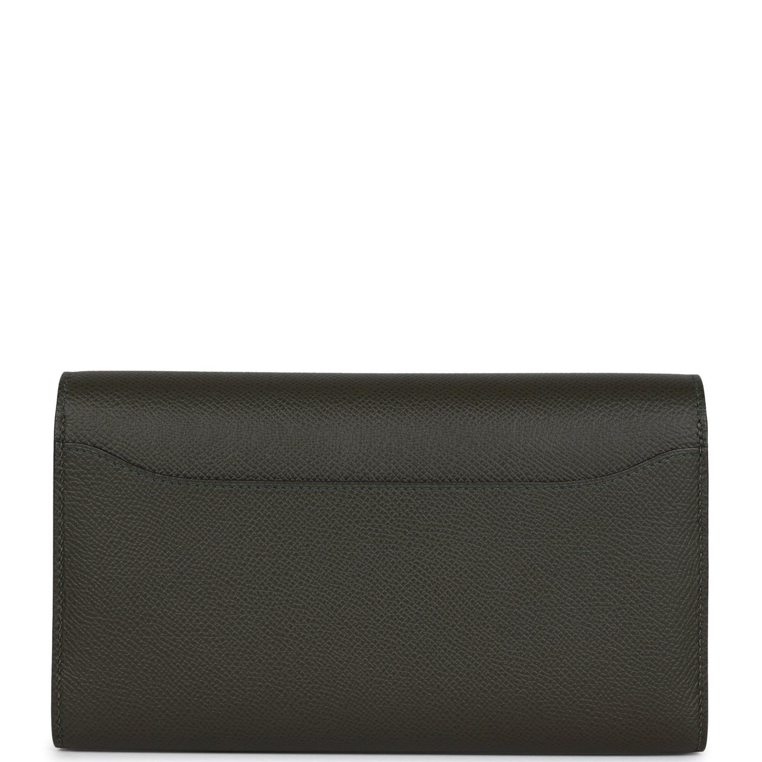 Constance Wallet To Go is in Vert De Gris epsom leather with gold hardware and has tonal stitching, metal "H" snap lock closure, open front compartment and removable crossbody strap.