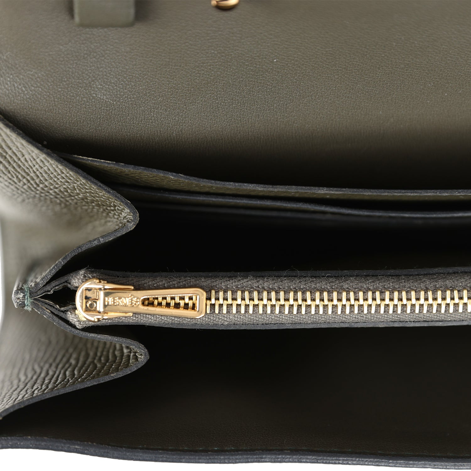 The interior is lined with Vert De Gris epsom leather and two main compartments with six credit card slots and a zippered center compartment with Hermes H lock pull.
