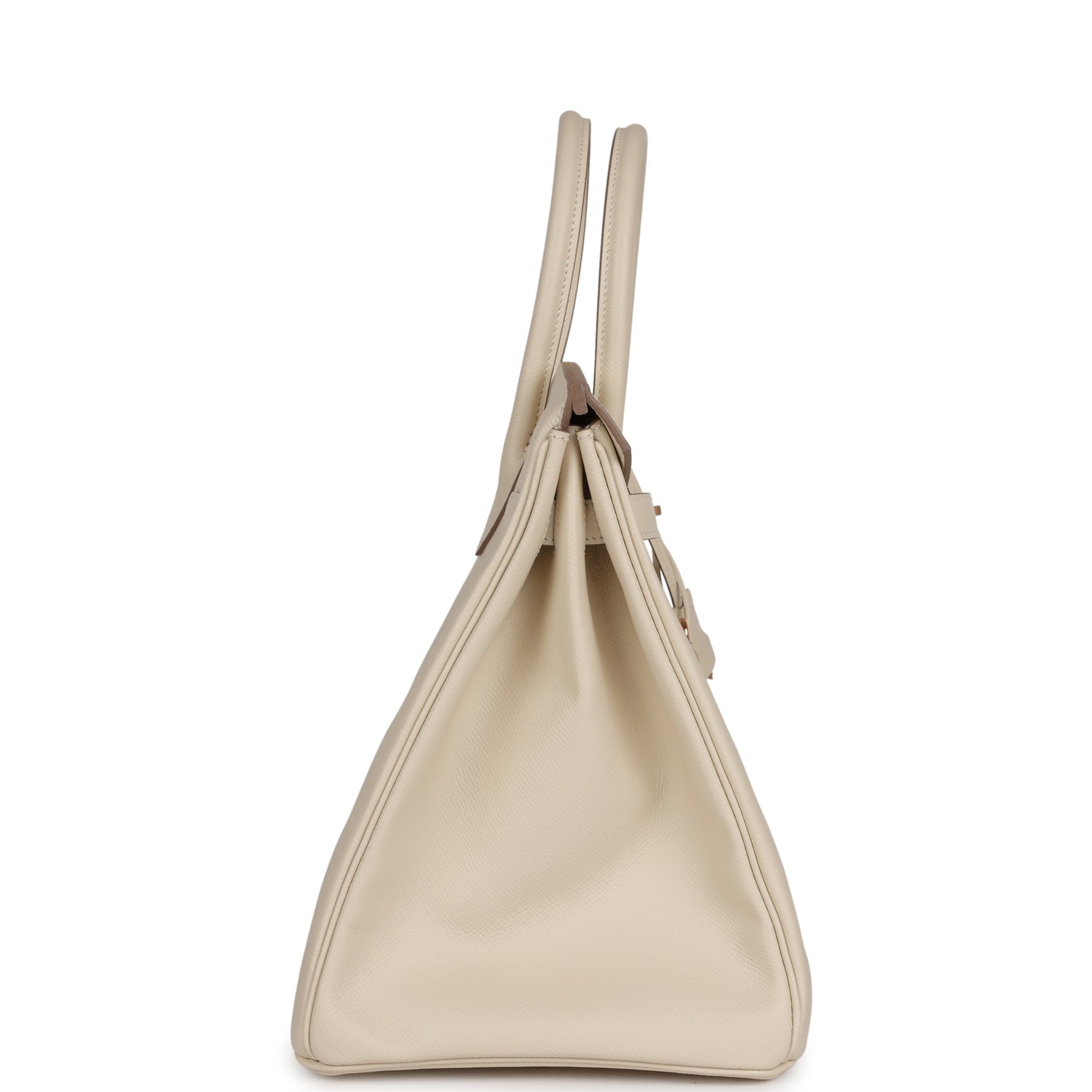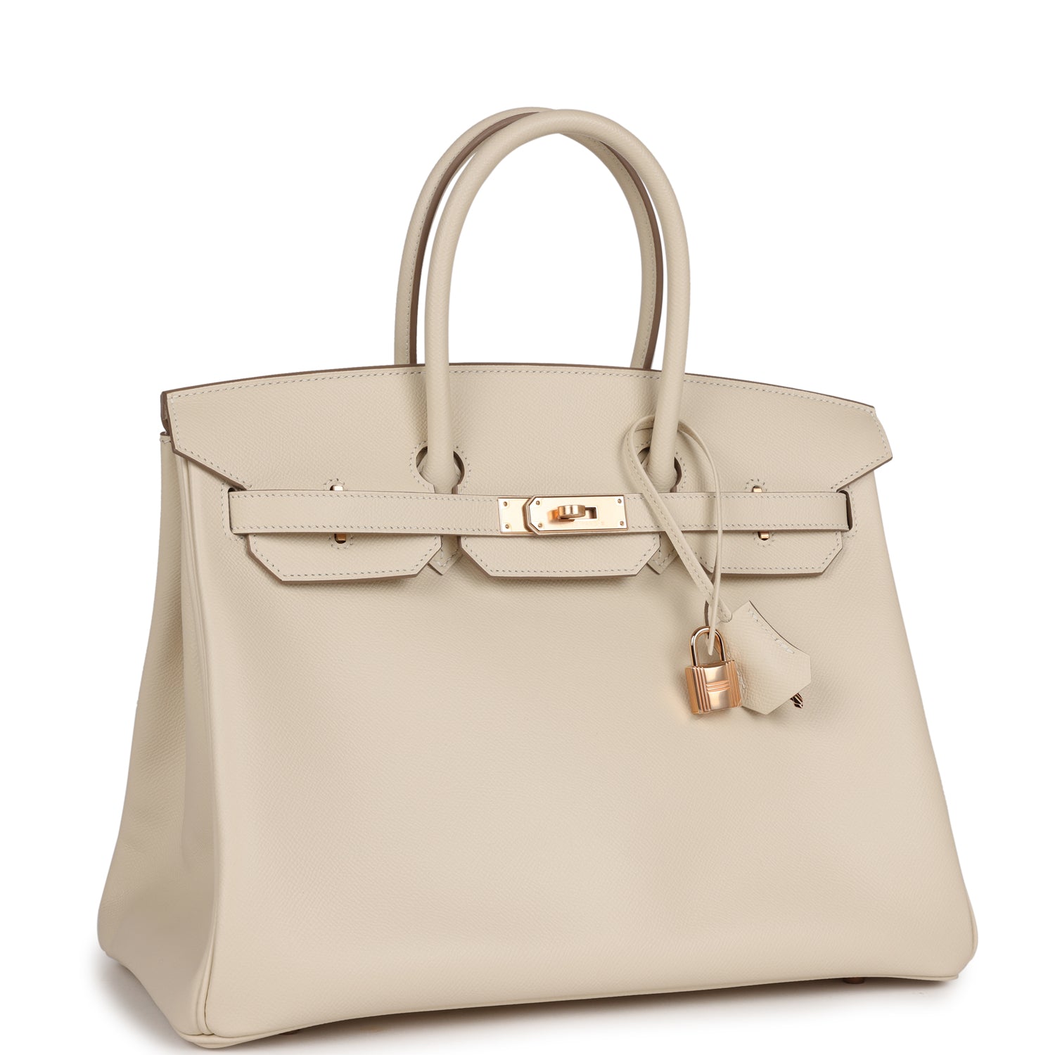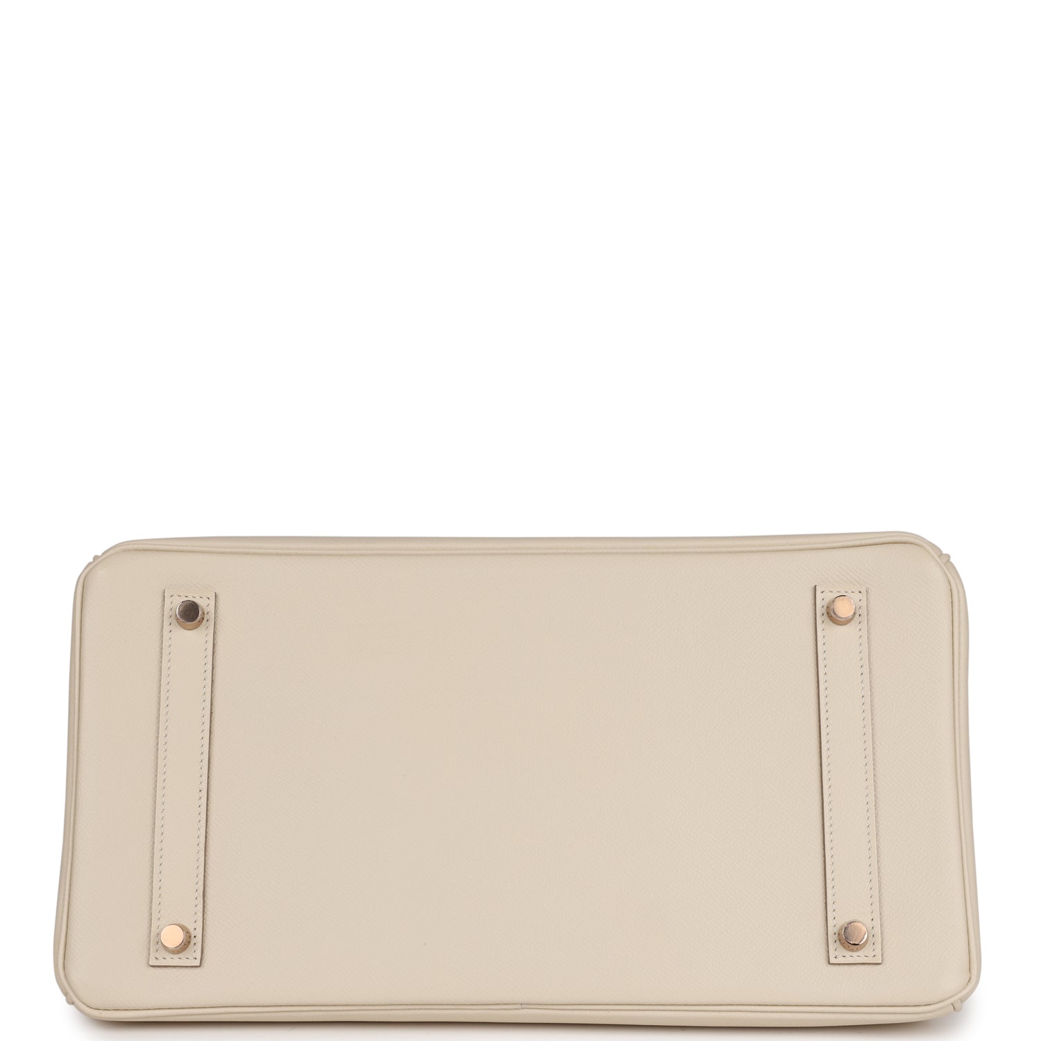 This Birkin is in Craie epsom leather with gold hardware and has tonal stitching, two straps with front toggle closure, clochette with lock and two keys and double rolled handles.