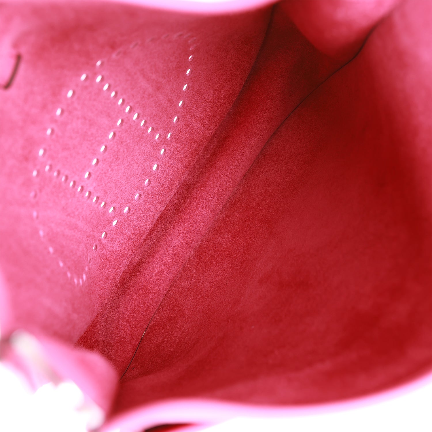 This Evelyne is in Rose Shocking clemence leather with palladium hardware and has tonal stitching, pull tab top closure and Rose Shocking removable canvas and leather shoulder/crossbody strap.