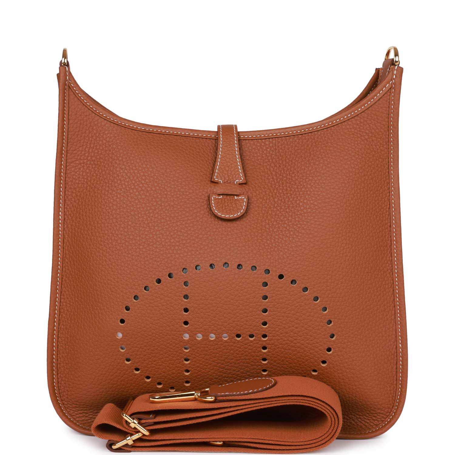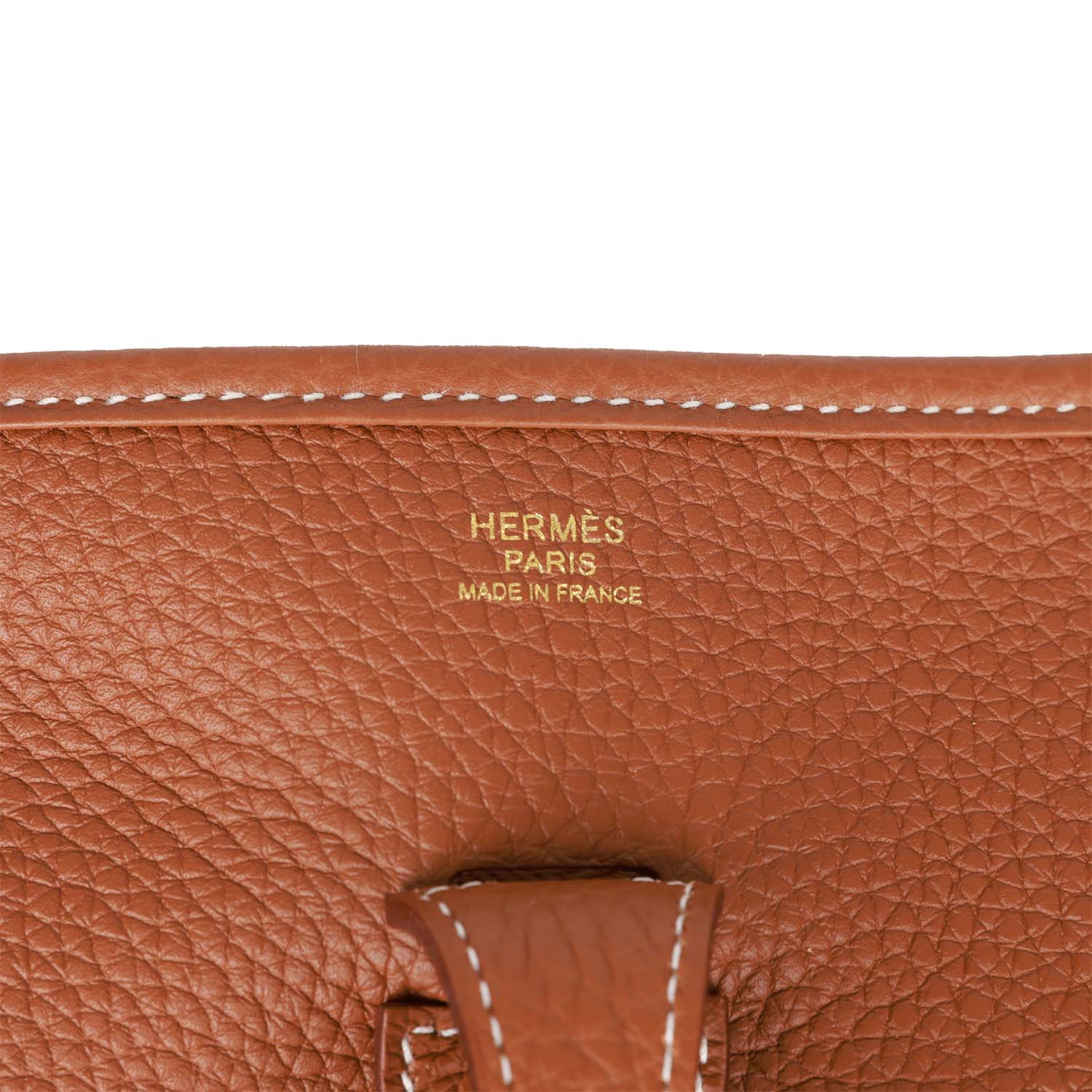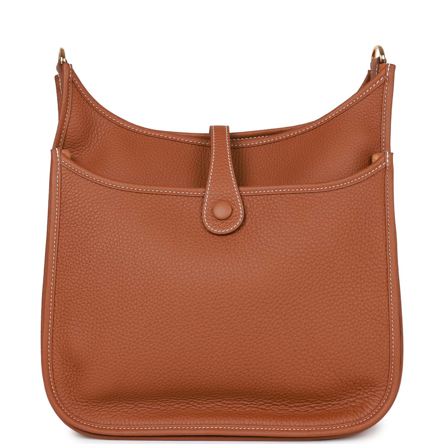 This Evelyne III PM is in gold clemence leather with gold hardware and has contrast stitching, pull tab top closure and gold removable canvas and leather shoulder/crossbody strap.