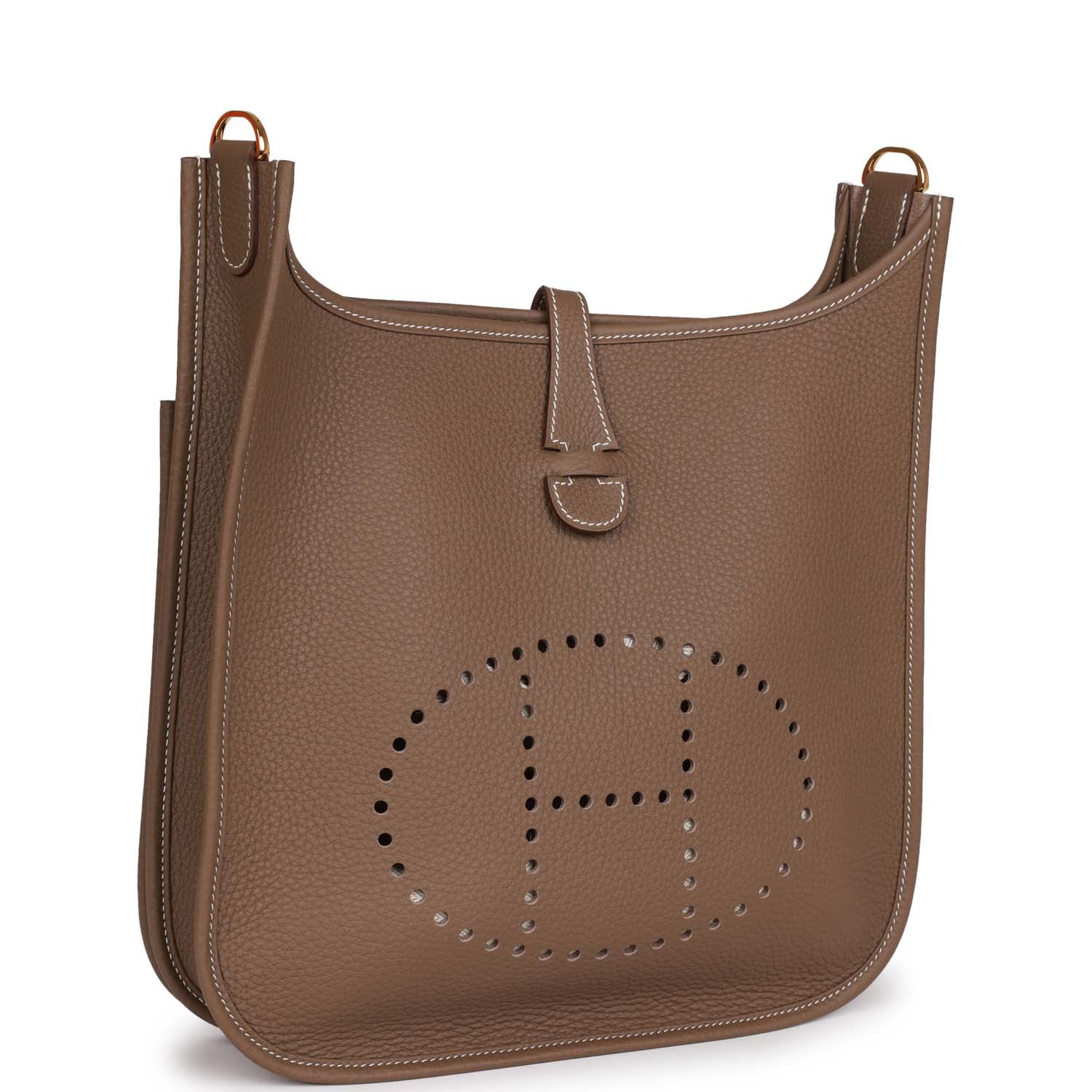 This Evelyne is in Etoupe clemence leather with gold hardware and has contrast stitching, pull tab top closure and Etoupe removable canvas and leather shoulder/crossbody strap.