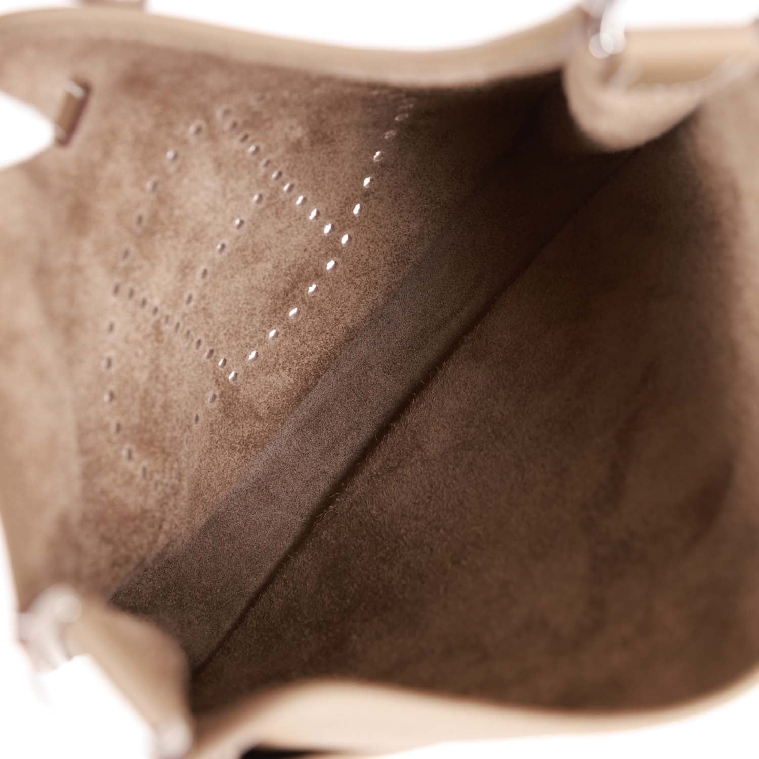 This Evelyne is in Etoupe clemence leather with palladium hardware and has contrast stitching, pull tab top closure and Etoupe removable canvas and leather shoulder/crossbody strap.